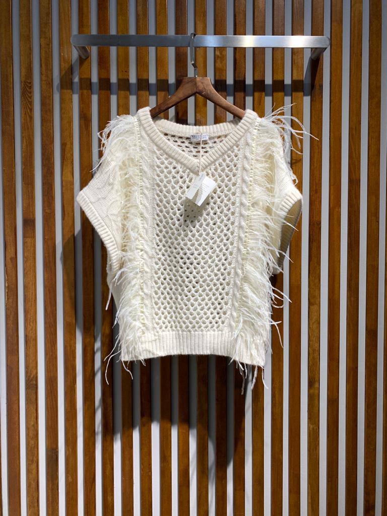 Жилет Brunello Cucinelli LUX-95971 — это воплощение изысканности и стиля. Жилет молочного цвета с узором в виде сетки, дополненный бахромой, выглядит элегантно и утонченно. Он станет прекрасным дополнением к любому образу.