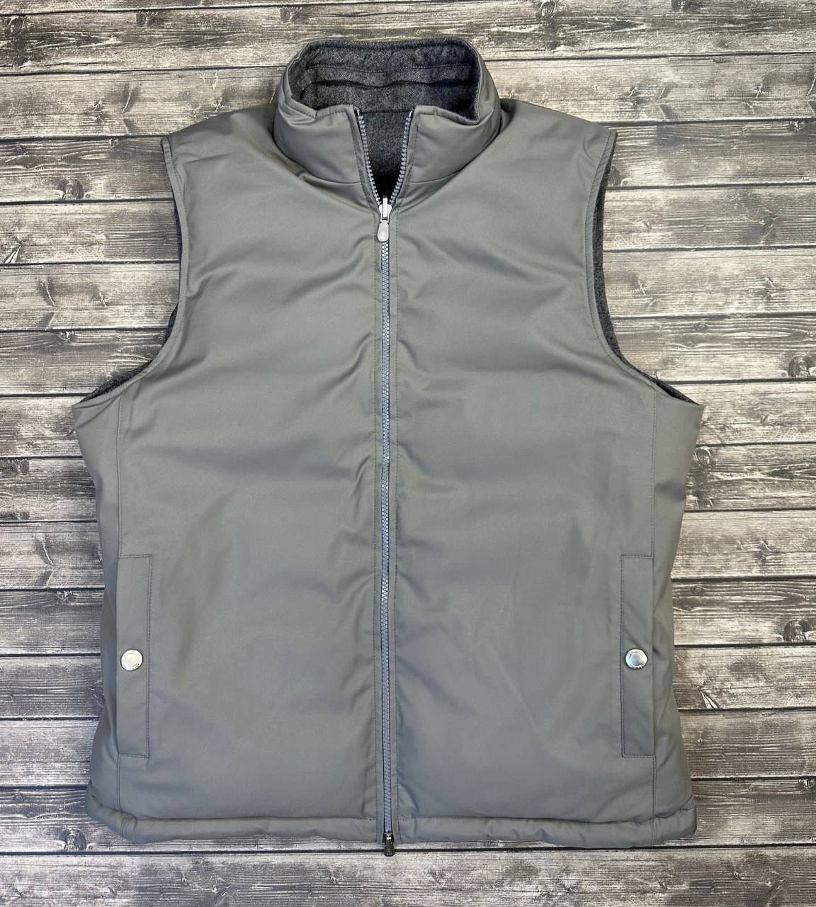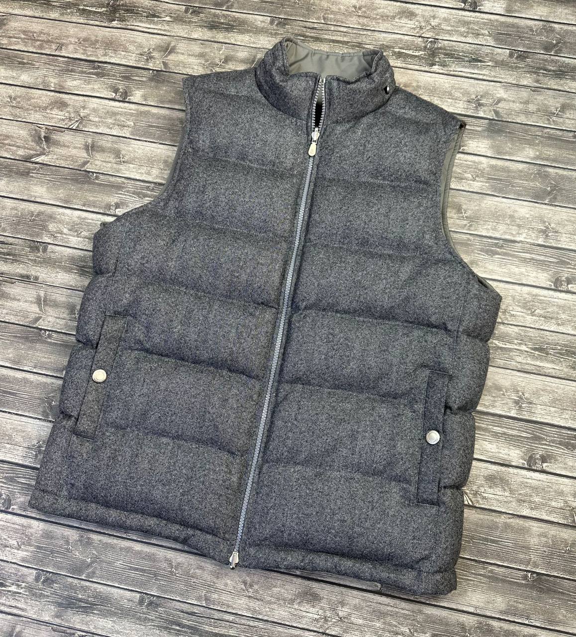 Жилет двухсторонний Brunello Cucinelli LUX-99371 – это стильный и функциональный предмет гардероба. Жилет выполнен в сером цвете, что делает его универсальным для различных образов. Текстура ткани, вероятно, имеет эффект "мягкой шерсти".