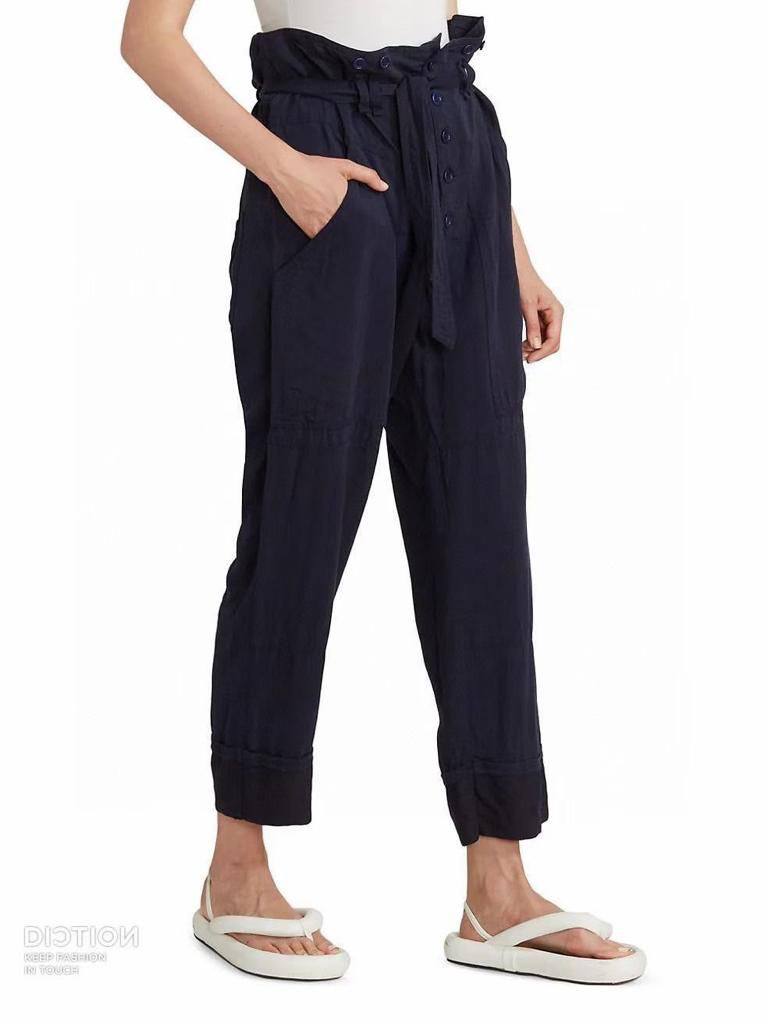 Брюки LUX-71991 — это стильные брюки в темно-синем цвете, выполненные в современном дизайне. Брюки имеют высокую талию с поясом, украшенным пуговицами и завязками, а также удобные боковые карманы. Ткань выглядит легкой и подходит для повседневной носки, обеспечивая комфорт и практичность.