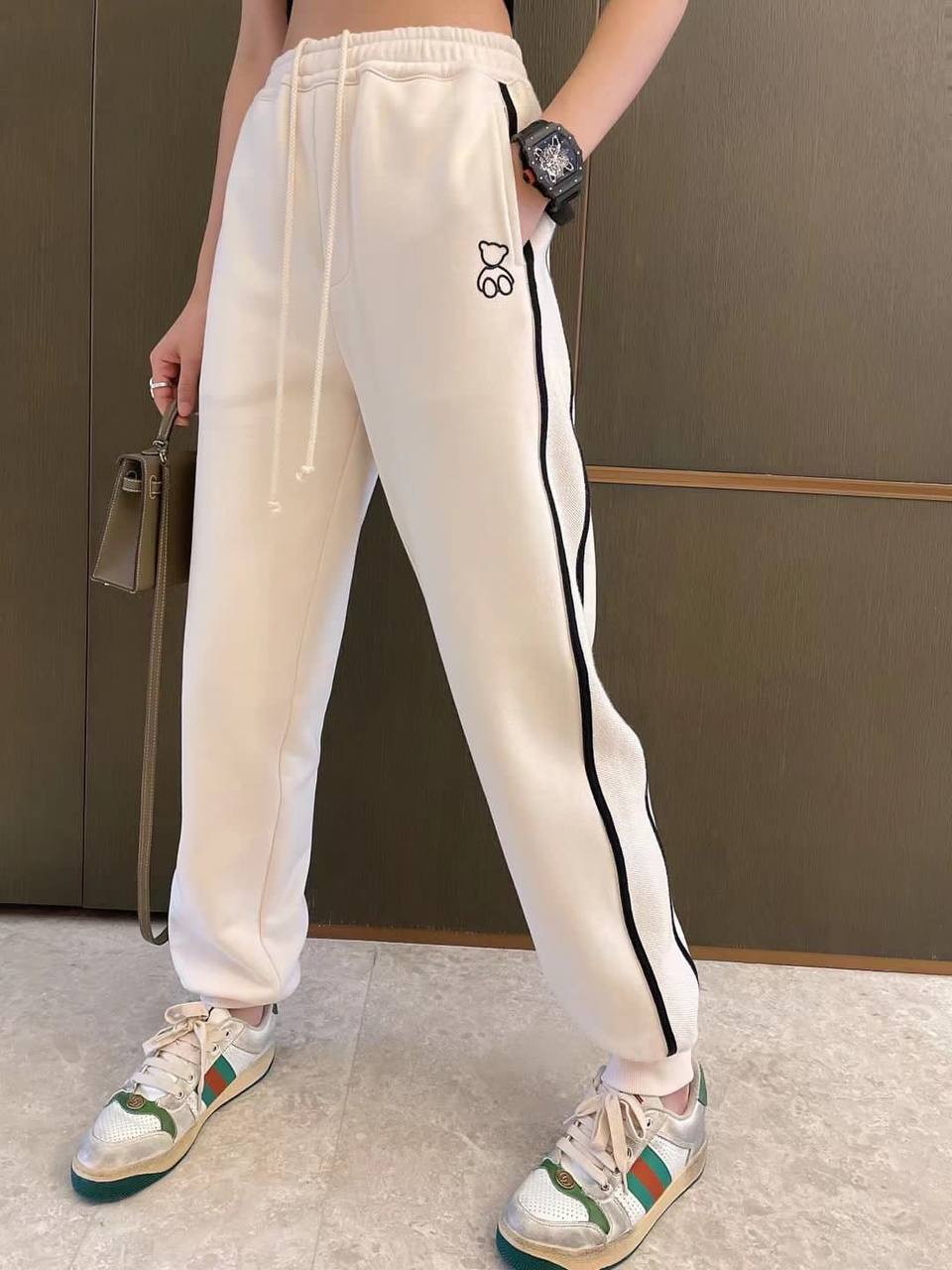 Брюки LUX-76597 — это стильные спортивные брюки, сочетающие комфорт и современный дизайн. Они выполнены в кремовом цвете с черными полосками по бокам и вышивкой. Эти брюки идеально подходят для создания повседневных образов в спортивном стиле.