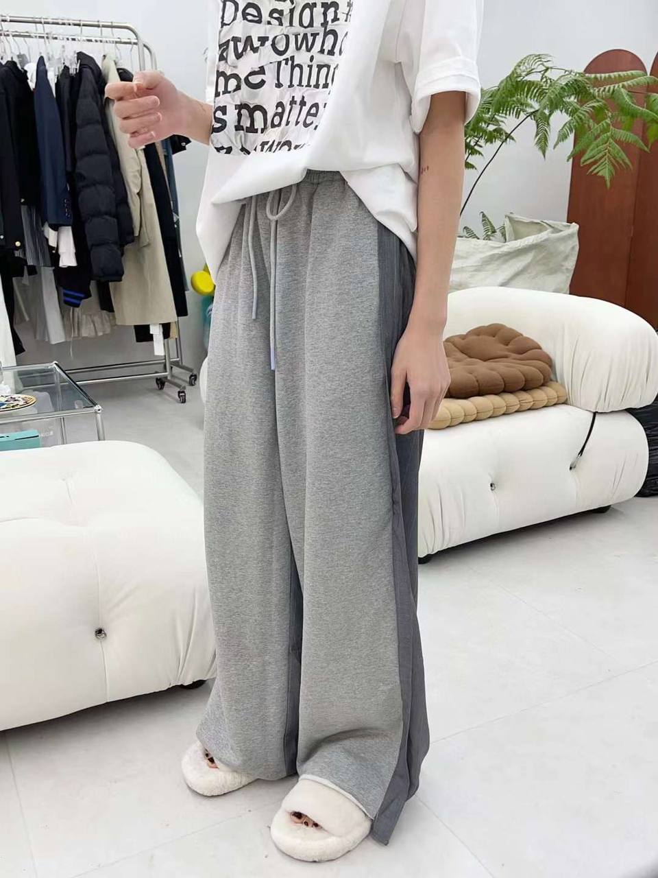 Брюки LUX-85405 — это сочетание стиля и комфорта. Эти брюки, представленные на изображении, выполнены в классическом сером цвете с оригинальным дизайном, сочетающим серый материал и полосатый принт. Они подходят для создания как повседневных, так и более формальных образов.