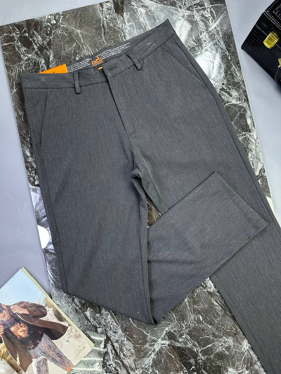 Брюки LUX-97357 — это стильная и элегантная модель от Hermes. Брюки представлены в классическом сером цвете, что делает их универсальным вариантом для различных образов. Текстура ткани создает интересный визуальный эффект.