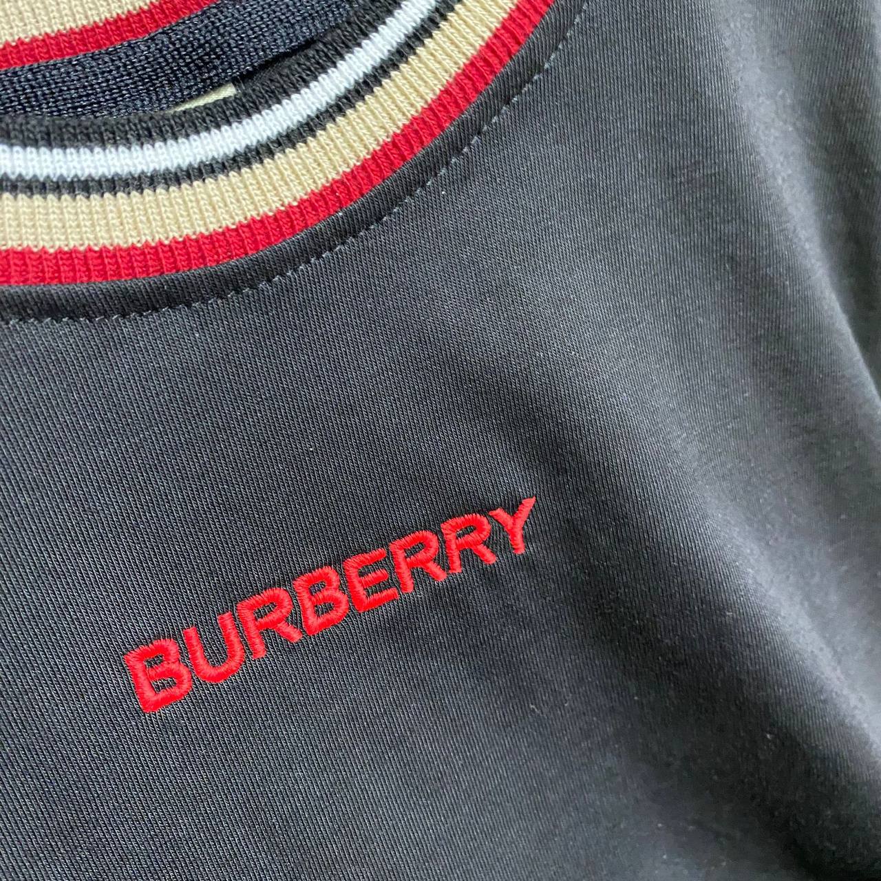 Футболка Burberry LUX-83533 - это стильный предмет гардероба, выполненный в классическом стиле. Она черного цвета, с контрастными деталями на воротнике и рукавах. На груди расположен логотип бренда. Футболка подойдет как для повседневной носки, так и для создания более элегантных образов.