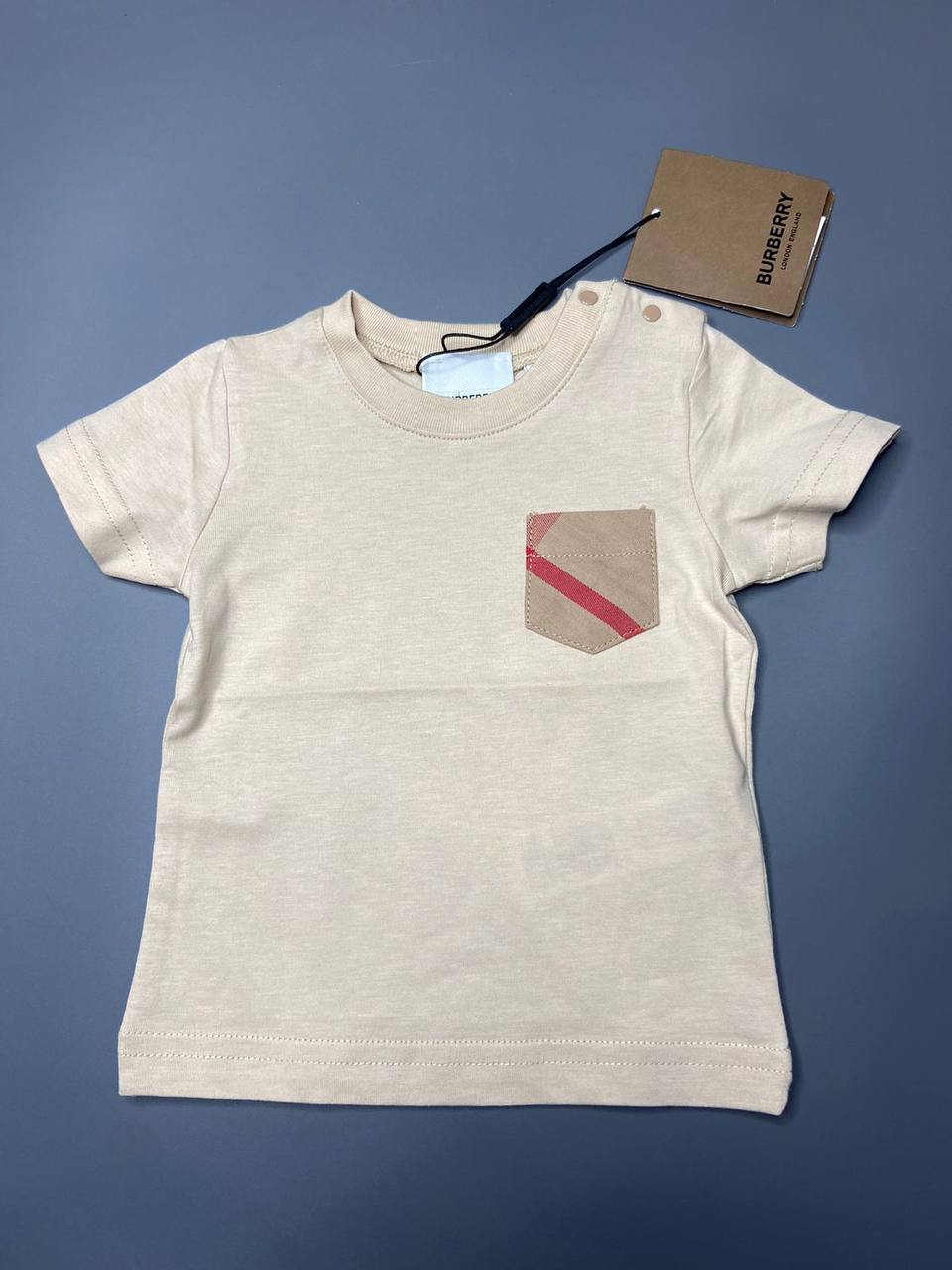 Футболка Burberry LUX-103135 – это стильный предмет гардероба для детей, выполненный в бежевом цвете. Она имеет круглый воротник и короткие рукава, обеспечивая комфорт и свободу движений. Футболка декорирована небольшим карманом с фирменным узором бренда.