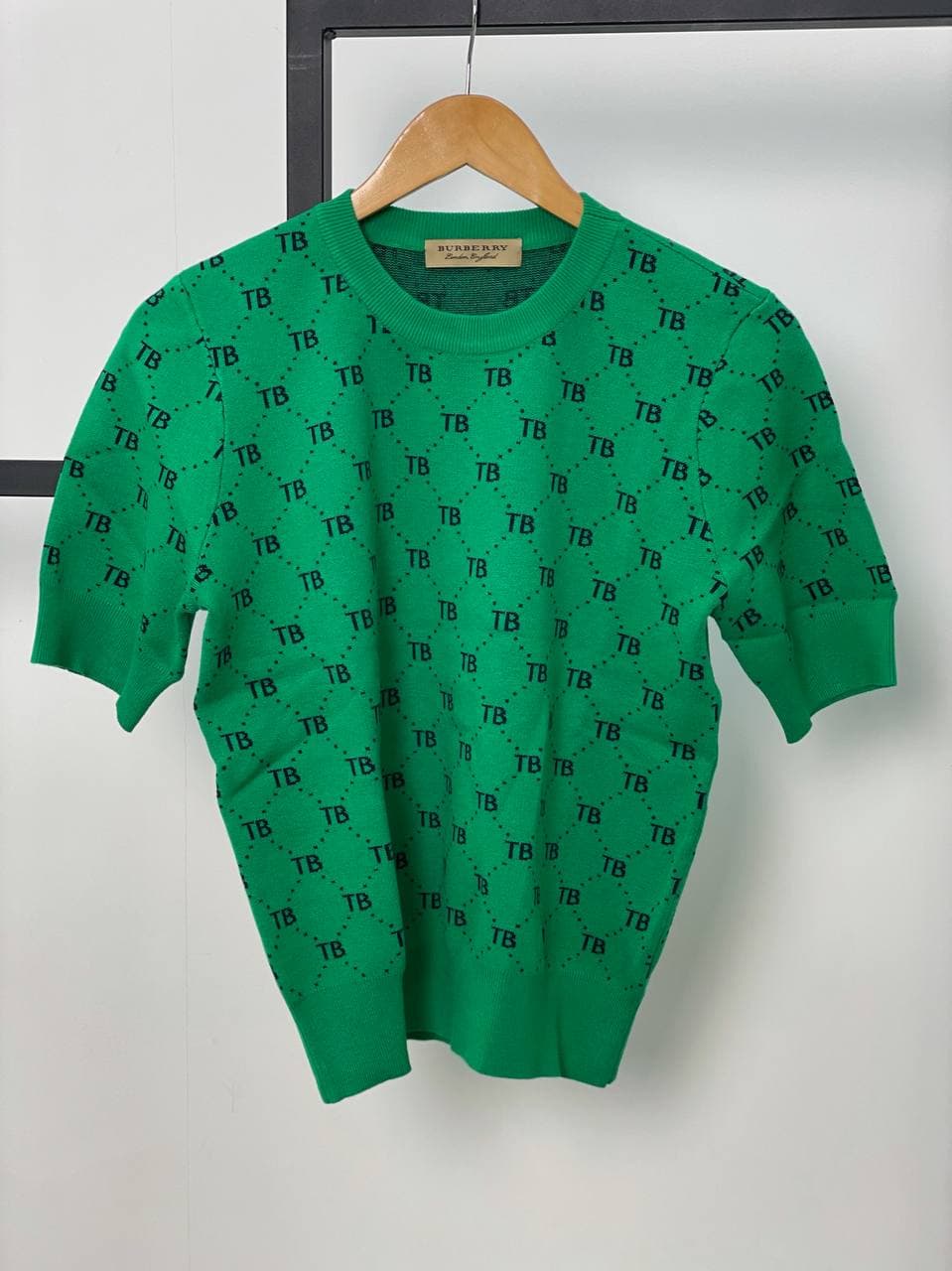Представлена стильная кофта от Burberry, артикул LUX-54311, выполненная в ярком зеленом цвете. Изделие с короткими рукавами украшено оригинальным принтом из инициалов "TB", расположенных в ромбовидной сетке, что придает ему узнаваемый фирменный стиль. Эта кофта идеально подходит для создания элегантных и современных образов, сочетая в себе комфорт и модный дизайн.
