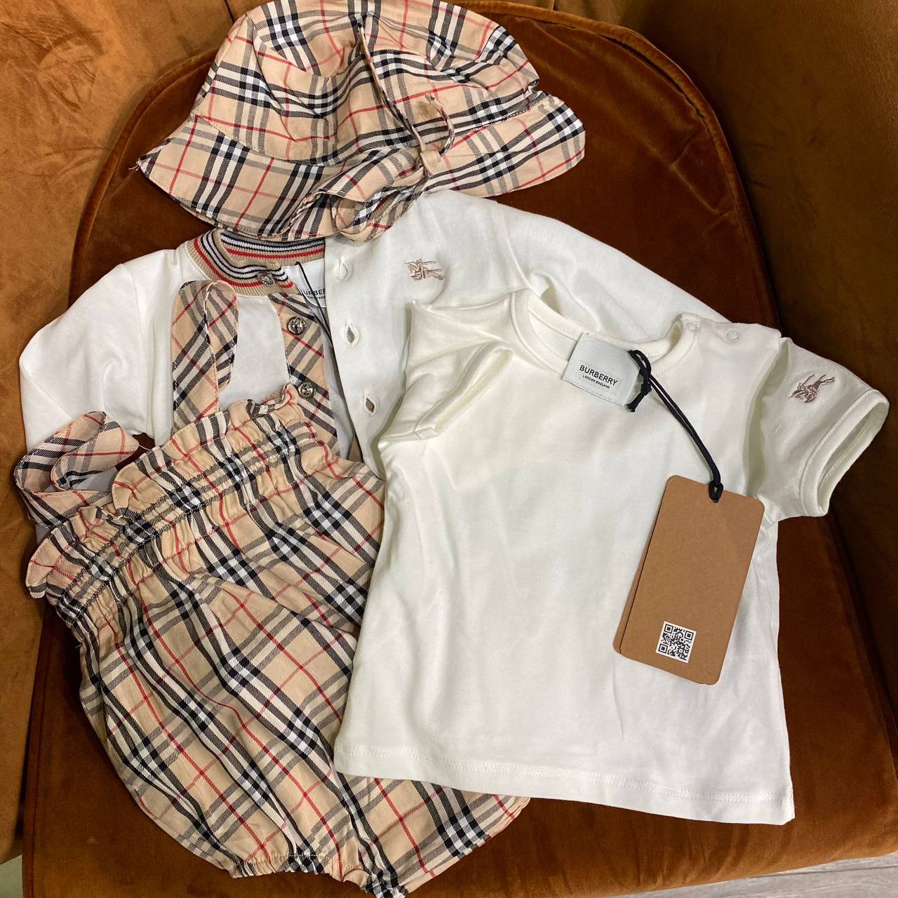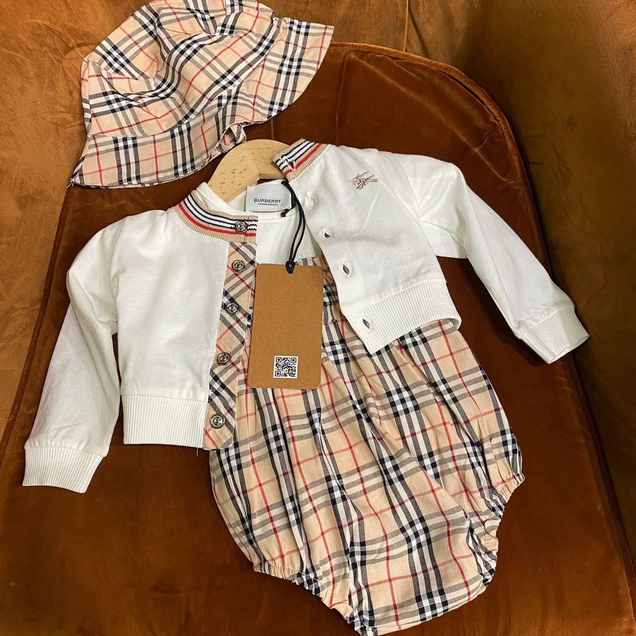 Комплект Burberry LUX-83699 представляет собой стильный ансамбль для детей, выполненный в фирменном стиле бренда. Комплект состоит из нескольких предметов одежды, включая футболку, комбинезон, шляпу и кофту. Вещи выполнены в сочетании кремового и бежевого цветов с характерным клетчатым узором Burberry.