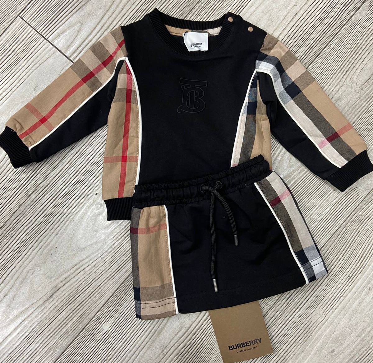 Burberry Костюм LUX-80558 представляет собой стильный комплект для детей, сочетающий в себе классический стиль и современный дизайн. Костюм выполнен в черном цвете с использованием знаменитого клетчатого принта Burberry в качестве акцентов. Этот комплект идеально подойдет для повседневной носки, создавая комфортный и модный образ.