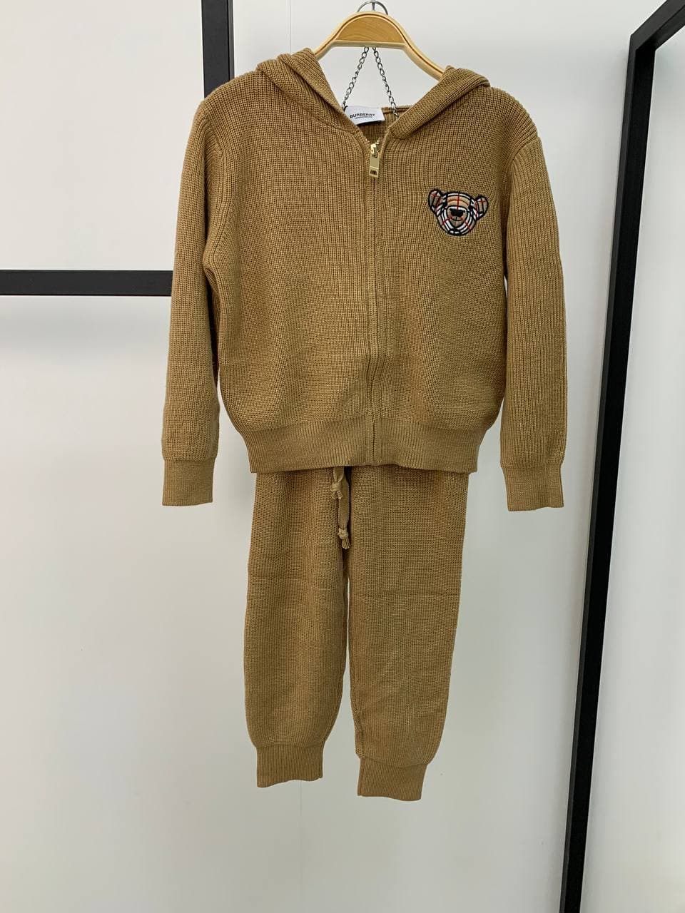 Костюм спортивный Burberry LUX-59480 выполнен в современном стиле, идеально подходящем для повседневного ношения. Комплект состоит из худи на молнии и брюк, выполненных в единой цветовой гамме. Декорирован нашивкой с изображением милого медведя, что придает ему оригинальность.