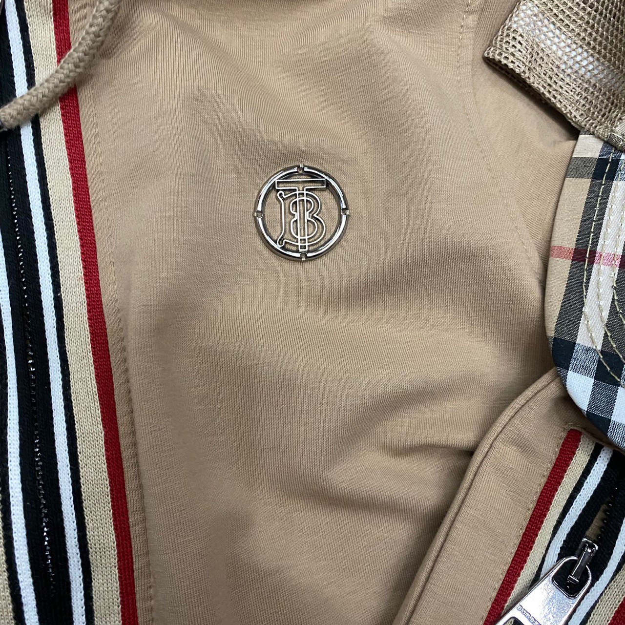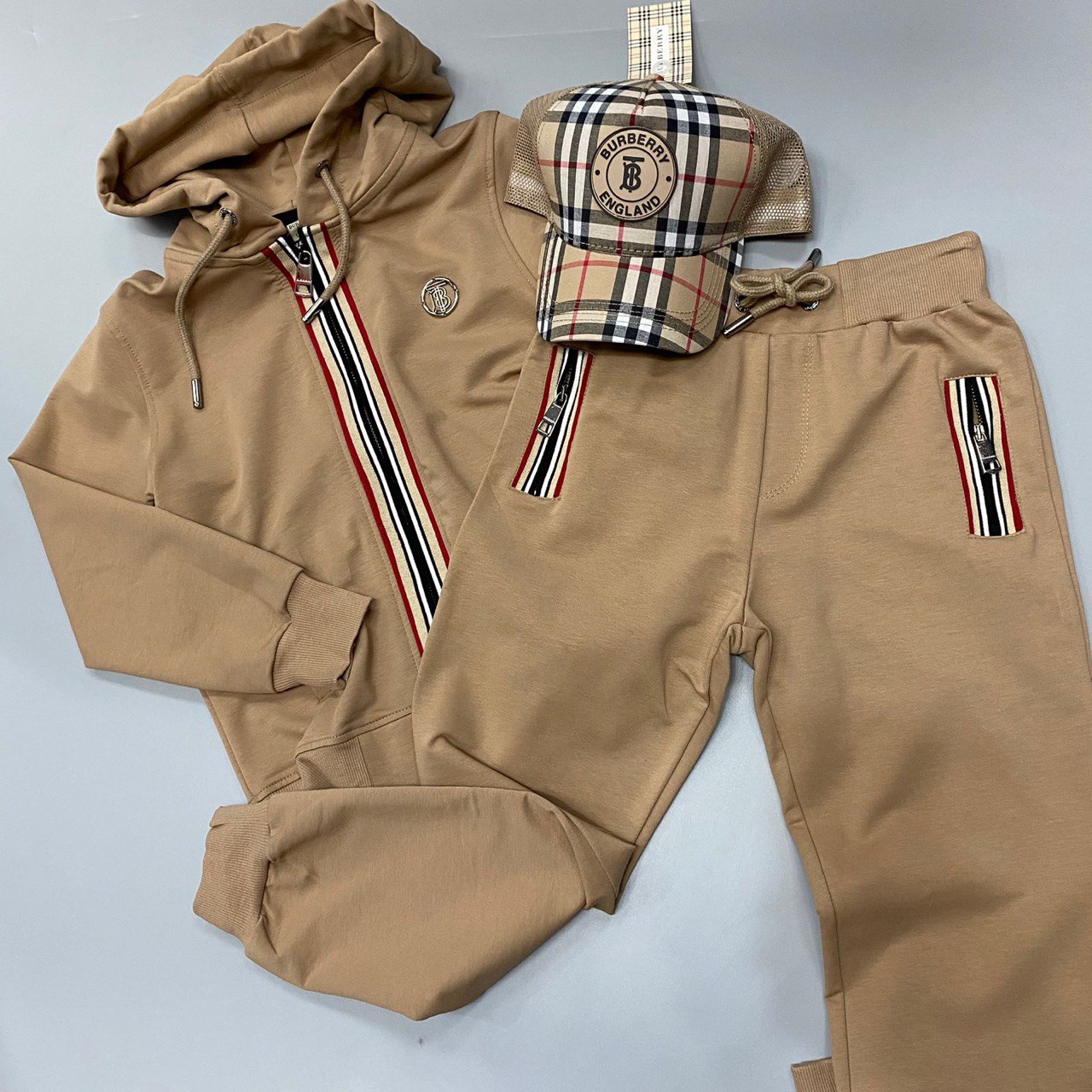 Костюм спортивный Burberry LUX-84241 представляет собой стильный и комфортный ансамбль для повседневной носки. Комплект выполнен в песочном цвете, дополнен декоративными полосками в фирменных цветах бренда. Спортивный костюм отличается современным дизайном и станет отличным выбором для активного образа жизни.