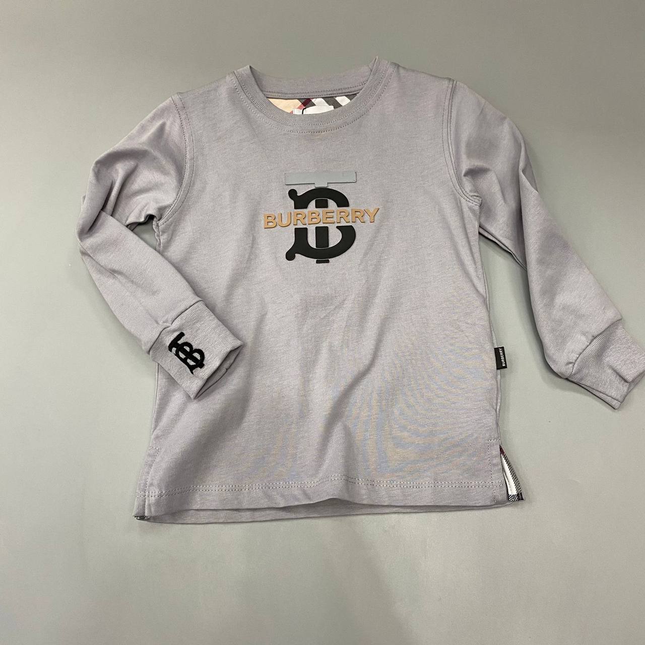 Лонгслив Burberry LUX-84069 – стильный элемент гардероба для детей. Серый лонгслив с длинными рукавами украшен логотипом бренда на груди и манжете. Это универсальная вещь для повседневной носки, которая подойдет для различных ситуаций.
