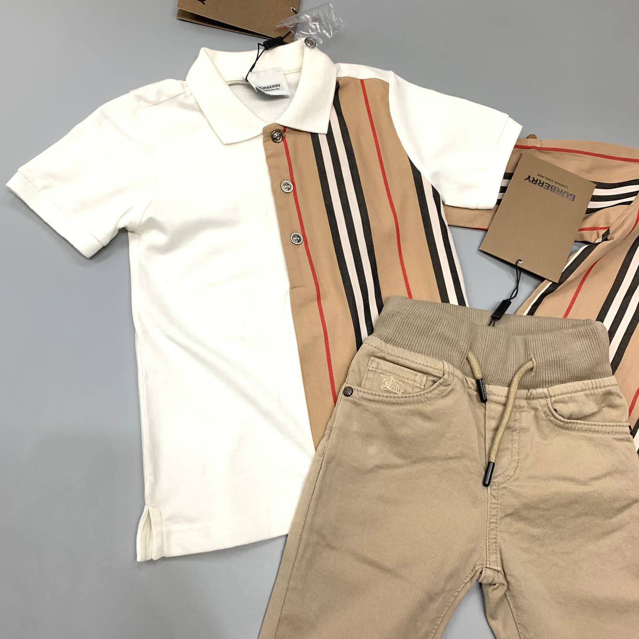 Поло Burberry LUX-83871 – это классическое поло для детей, сочетающее в себе элегантность и комфорт. Модель выполнена в основном белом цвете с акцентной вставкой спереди, украшенной фирменными полосками бренда. Идеально подходит для повседневной носки и особых случаев.