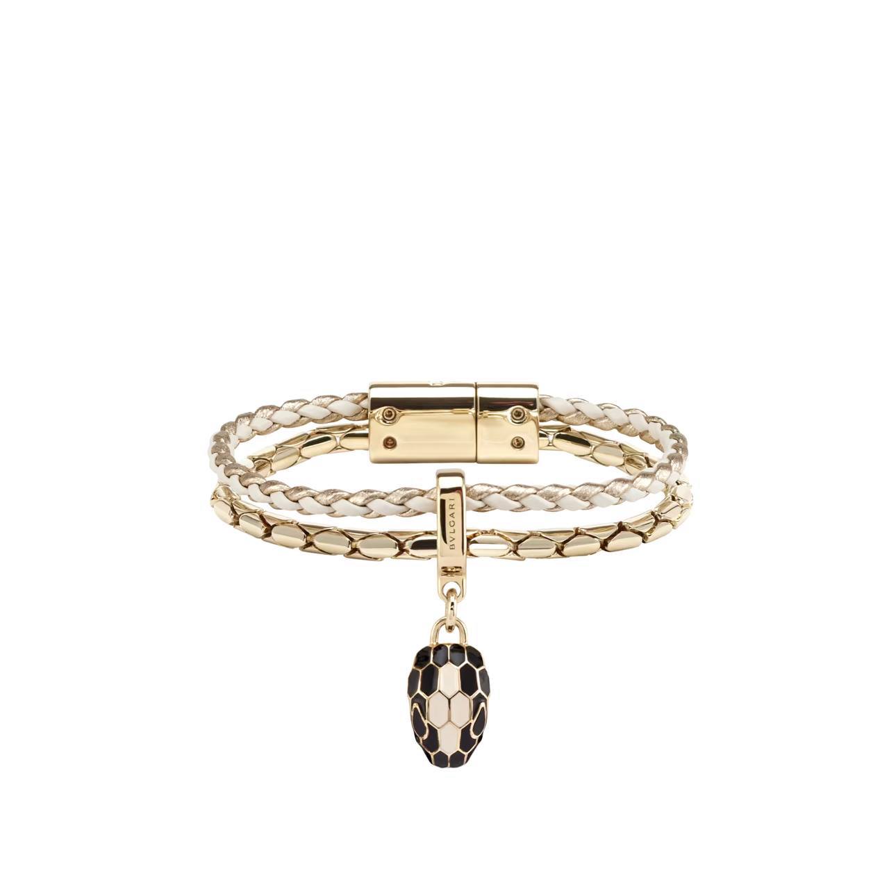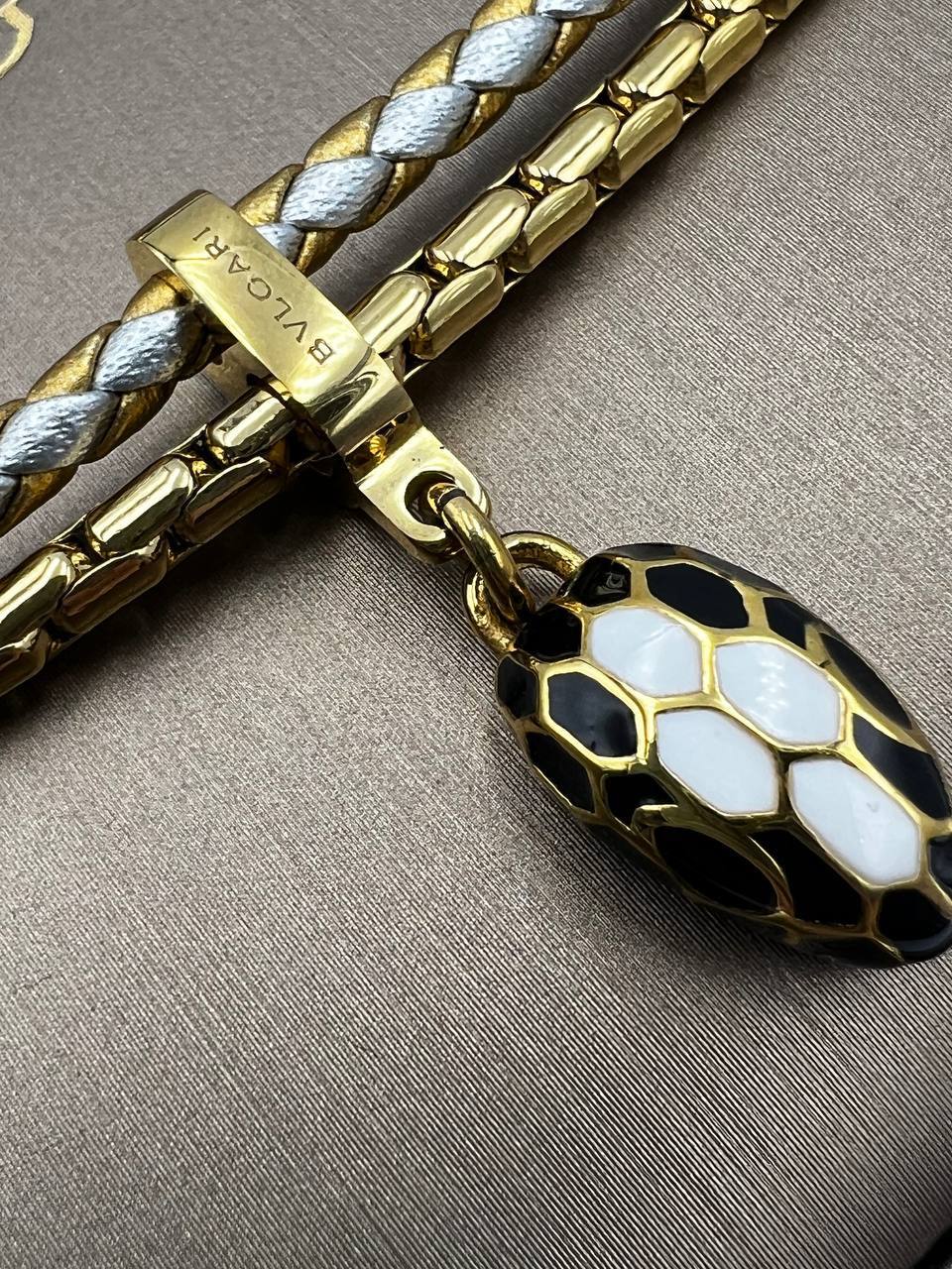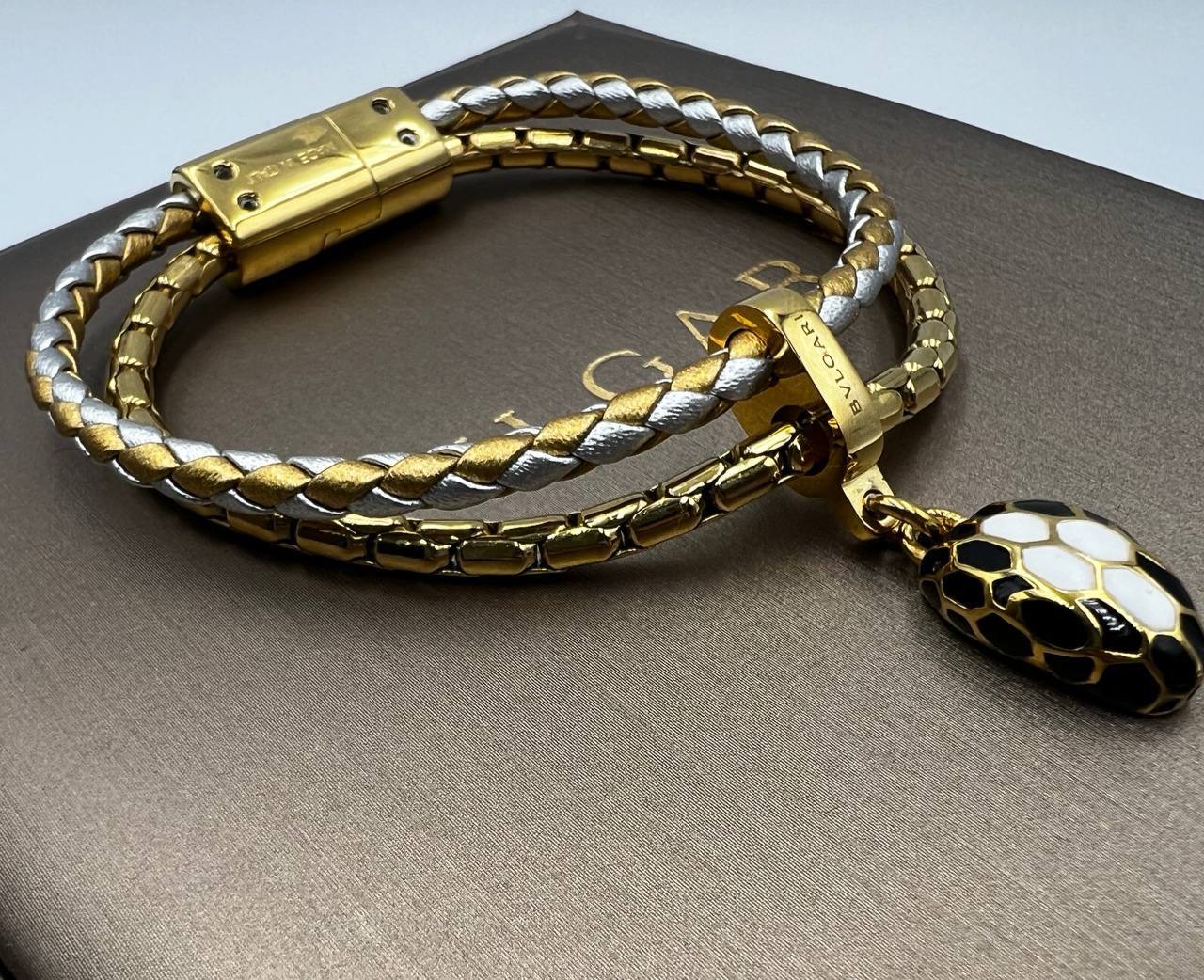 Браслет Bvlgari LUX-104449 – это элегантное украшение, сочетающее в себе изысканный стиль и высокое качество исполнения. Браслет выполнен в золотистом и серебристом цветах с плетеной текстурой. Дизайн дополнен подвеской в виде головы змеи, украшенной эмалью.