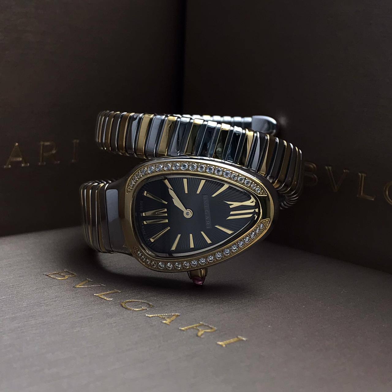 Часы Bvlgari LUX-113061 - это изысканный аксессуар, сочетающий в себе роскошь и элегантность. Дизайн часов выполнен в форме змеи, обвивающей запястье, что придает им неповторимый стиль. Черный циферблат с золотистыми деталями и инкрустацией бриллиантами создает эффектный контраст.