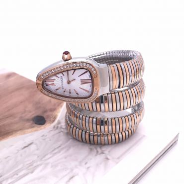Часы Bvlgari LUX-83107 — это роскошные женские часы, выполненные в элегантном стиле. Часы выполнены в золотом цвете с серебристым циферблатом, инкрустированным бриллиантами. Дизайн часов представляет собой змеевидный браслет, что придает им неповторимый вид.