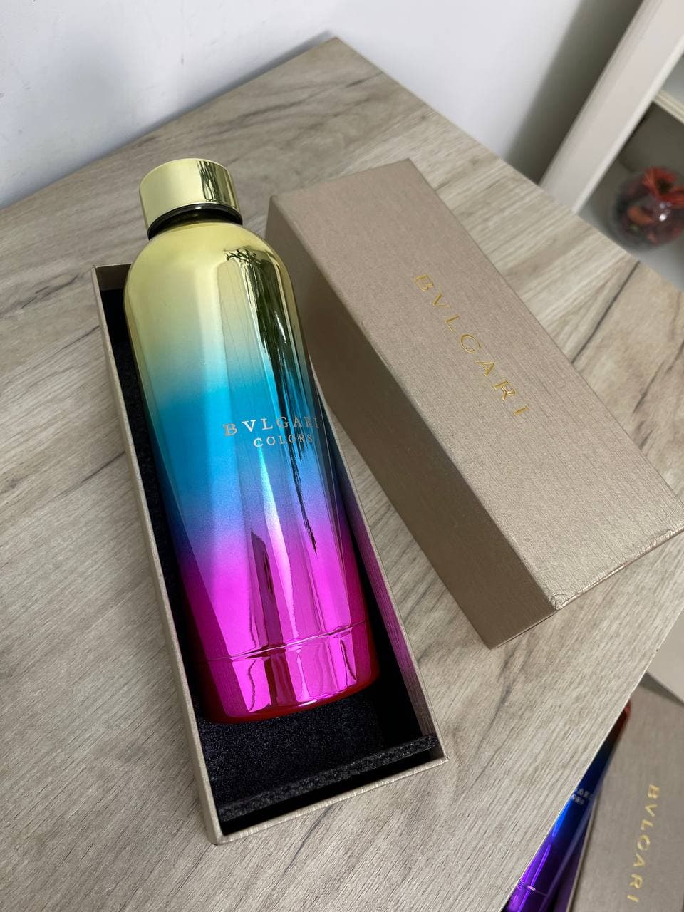 Фляга Bvlgari LUX-61865 представляет собой элегантный аксессуар, выполненный в стиле бренда Bvlgari. Её яркий градиентный дизайн, переходящий от золотистого к синему и ярко-розовому, делает её стильным дополнением к образу. Фляга предназначена для хранения напитков, идеально подходит для использования в повседневной жизни, в офисе, спортзале или во время путешествий.