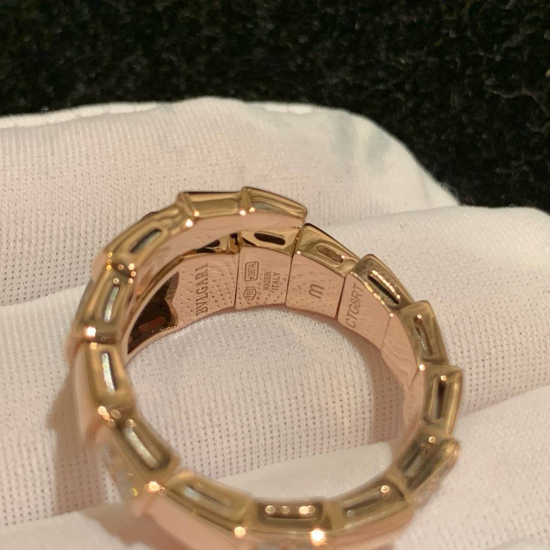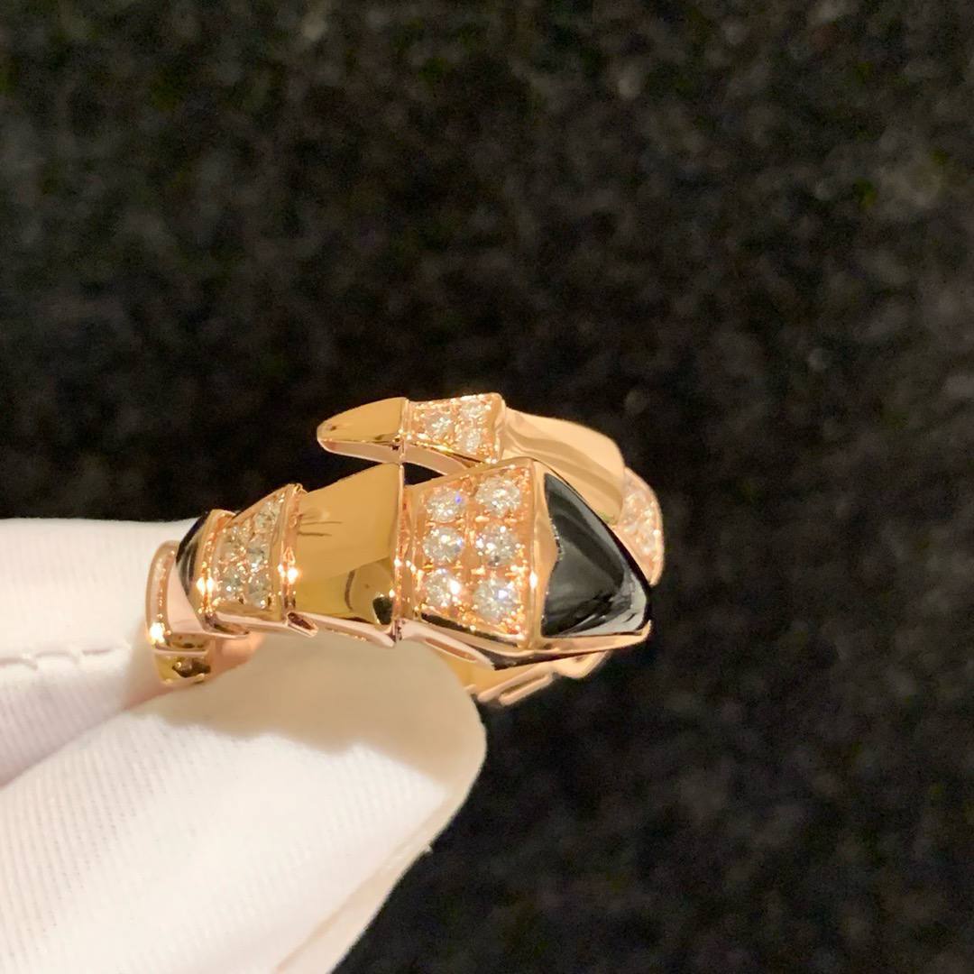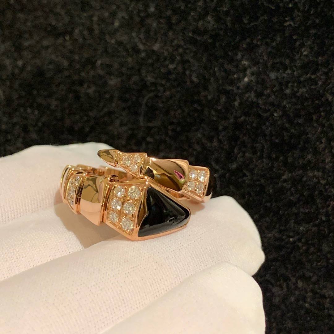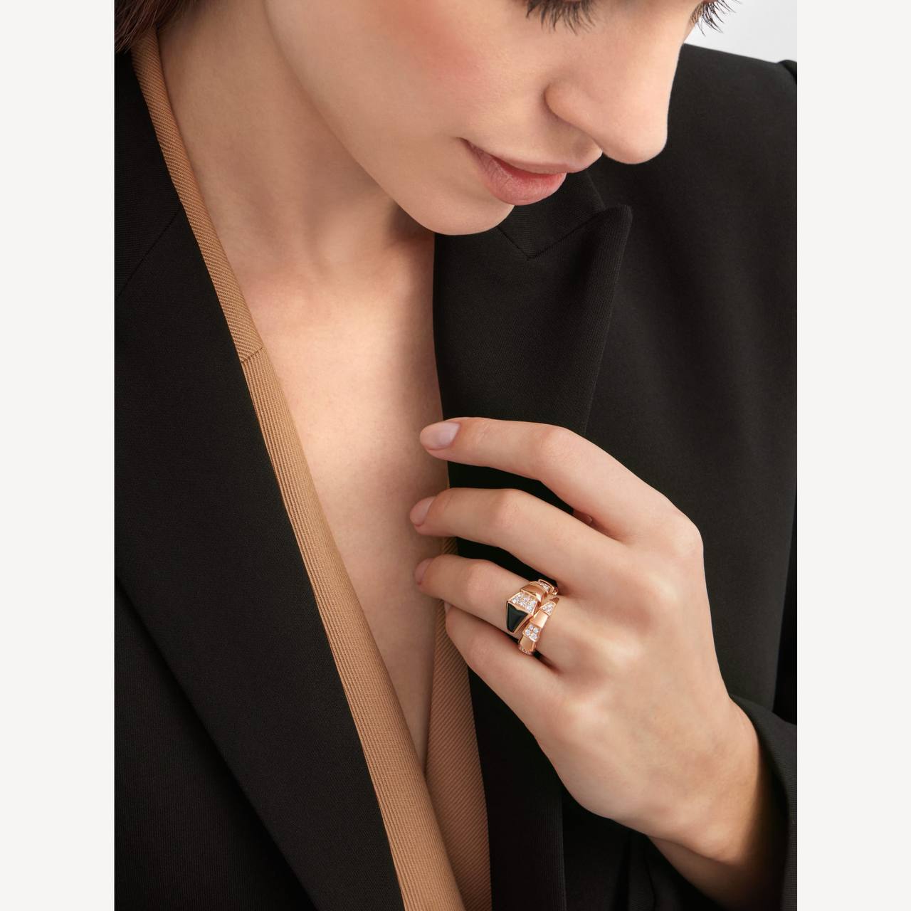 Кольцо Serpenti — это ювелирное изделие от Bvlgari, вдохновленное образом змеи. Кольцо выполнено в розовом золоте, с элементами черного цвета и украшено бриллиантами. Изысканный дизайн делает его прекрасным дополнением к любому образу.