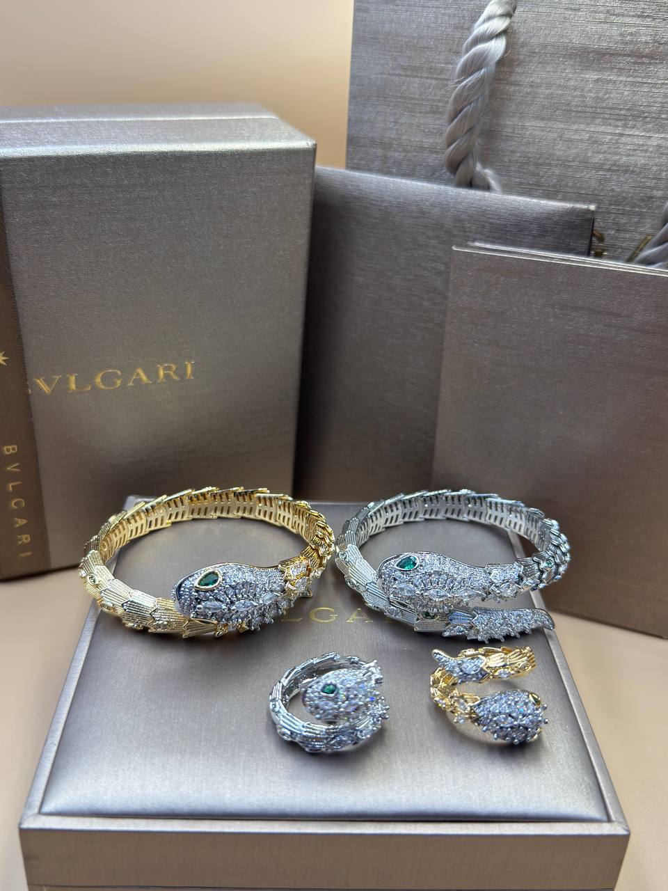 Набор браслет и кольцо Bvlgari LUX-116742 — это изысканный комплект, включающий браслет и кольцо. Изделия выполнены в стильном дизайне с деталями в форме змеи, украшенными камнями. Этот набор станет прекрасным дополнением к любому образу, подчеркивая индивидуальность и изысканный вкус.