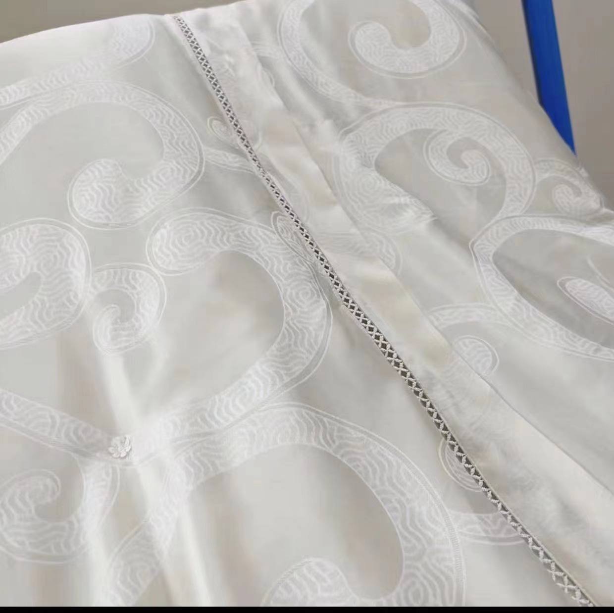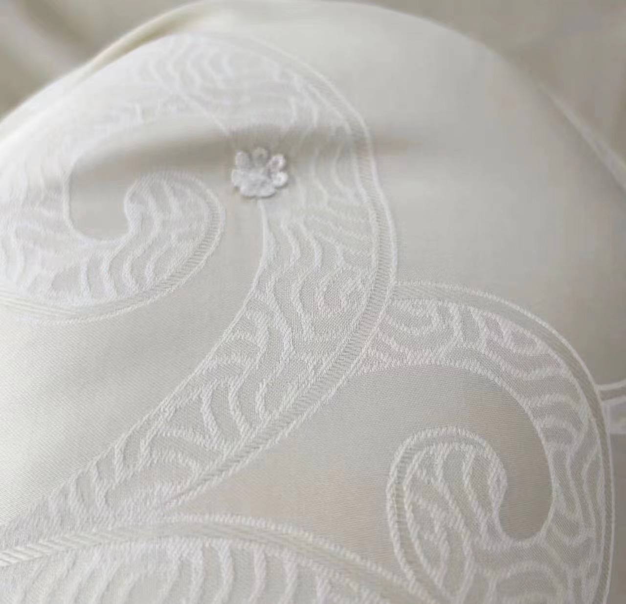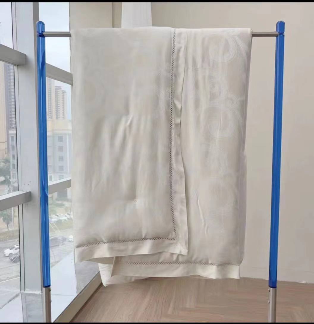 Одеяло Bvlgari LUX-114629, представленное на изображении, выполнено в элегантном стиле. Одеяло светлого цвета, вероятно, кремового, имеет гладкую текстуру и украшено декоративной строчкой по краям. Его основное назначение — создание комфорта и уюта в спальне.