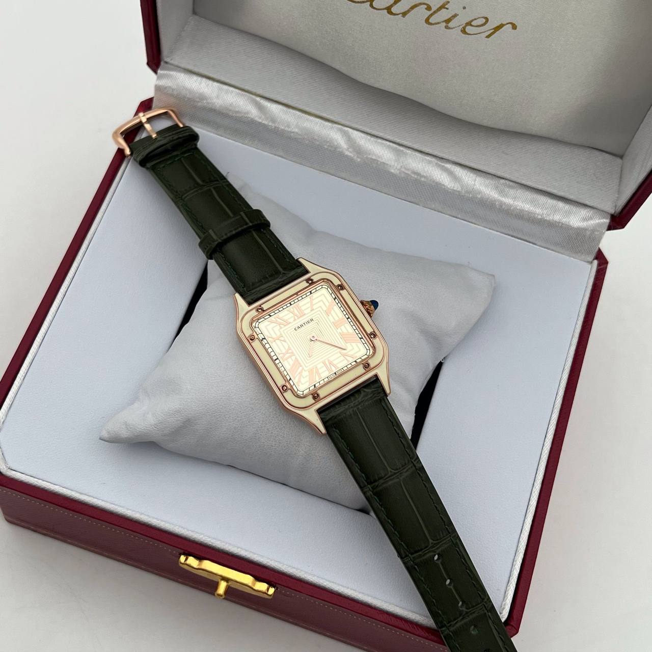 Часы Cartier LUX-102988 - это изысканный аксессуар, сочетающий в себе элегантность и функциональность. Прямоугольный корпус с циферблатом кремового цвета дополнен темно-зеленым ремешком с тиснением. Эти часы идеально подойдут как для повседневного ношения, так и для особых случаев, подчеркивая статус и вкус своего обладателя.