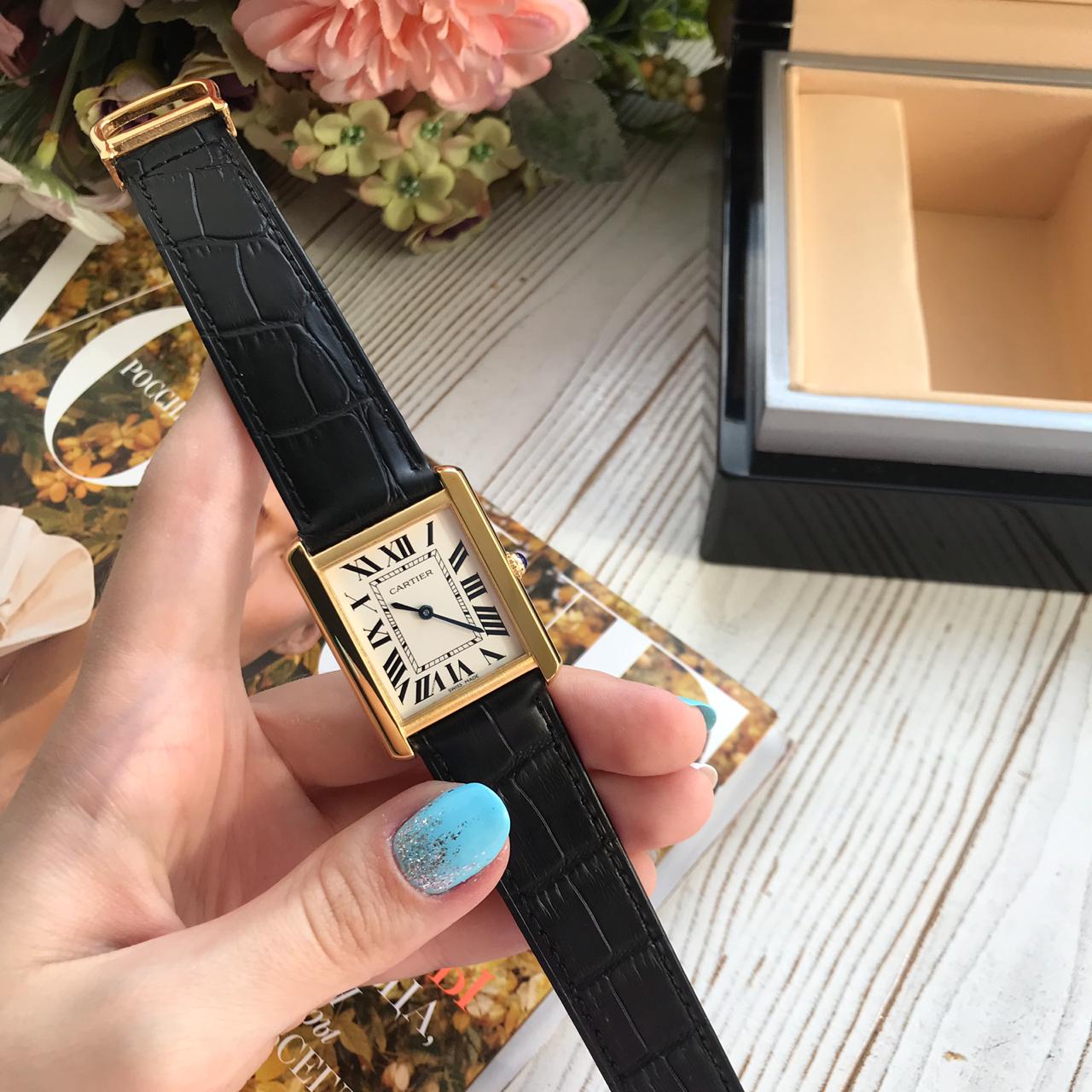 Женские часы Cartier LUX-16957 в золотом корпусе с черным ремешком — это воплощение элегантности и классического стиля. Изящный прямоугольный циферблат с римскими цифрами и синими стрелками подчеркивает утонченный вкус владелицы. Эта модель идеально подойдет для создания как делового, так и вечернего образа, добавляя ему роскоши.