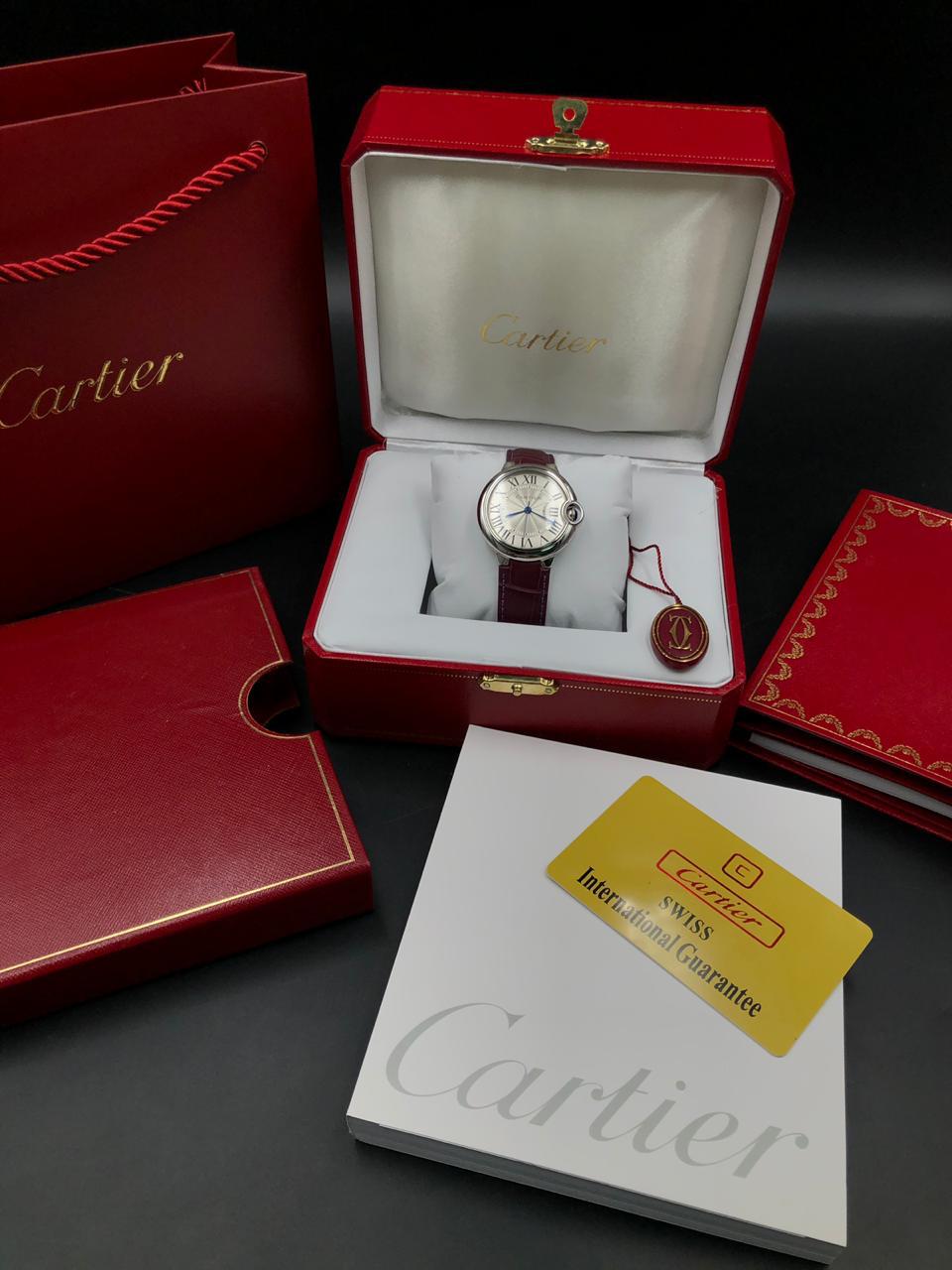 Эти элегантные женские часы Cartier LUX-11389, представленные в фирменной упаковке, являются воплощением классического стиля и изысканности. Серебристый циферблат с римскими цифрами и синими стрелками, дополненный бордовым кожаным ремешком, создает утонченный образ. Часы идеально подходят для женщин, ценящих роскошь и безупречное качество.