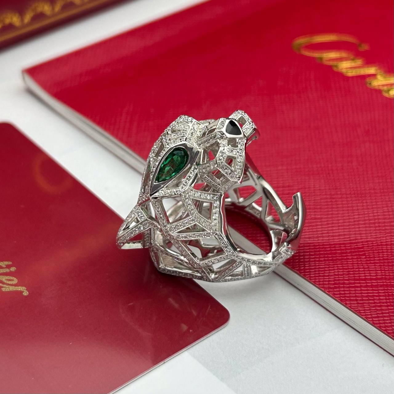 Кольцо Cartier LUX-105141 – это изысканное украшение, выполненное в виде головы пантеры. Кольцо выполнено в серебристом цвете с филигранным узором и инкрустацией бриллиантами. Зеленый камень в глазу добавляет элегантности и акцентирует внимание на деталях. Кольцо прекрасно подойдет для дополнения вечернего образа, а также для создания эффектного повседневного стиля.
