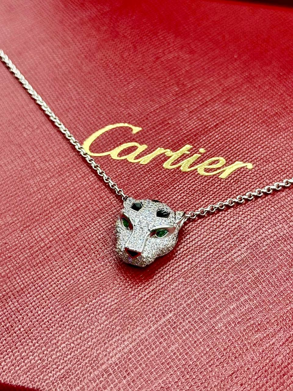 Колье Cartier LUX-106732 — это изысканное украшение, сочетающее в себе элегантность и роскошь. Колье выполнено в виде головы пантеры, инкрустированной сверкающими камнями и черными элементами. Идеально подойдет для создания эффектного образа на любом мероприятии.