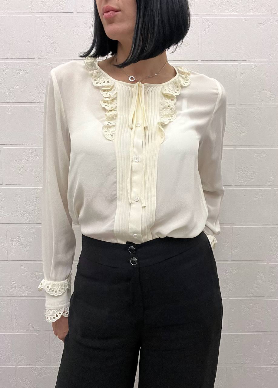 Блузка Celine LUX-109330 – элегантный предмет гардероба, сочетающий в себе классику и изысканность. Эта модель выполнена в молочном цвете с кружевными деталями на воротнике и манжетах, что добавляет нотку романтики. Блузка подойдет для создания как повседневных, так и более формальных образов.