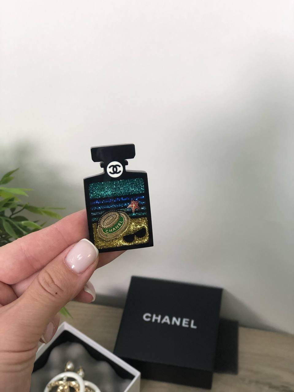 Брошь Celine LUX-52602 — это стильный аксессуар, выполненный в форме флакона духов. Она декорирована блестками, изображением пляжной тематики с соломенной шляпой и логотипом бренда, что придает ей изысканный и запоминающийся вид. Эта брошь станет ярким акцентом в вашем образе, подчеркивая индивидуальность и хороший вкус.