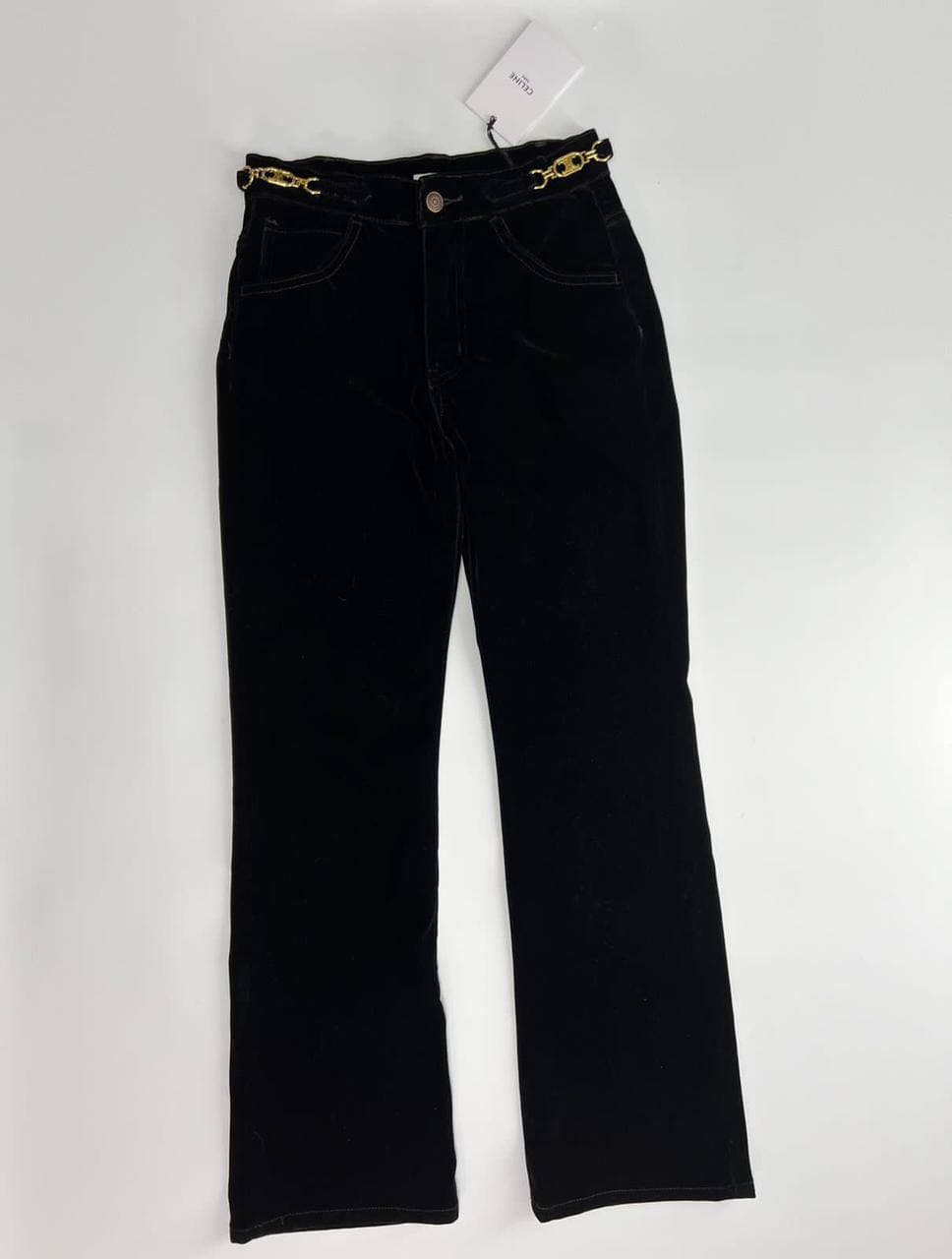 Брюки женские Celine LUX-64296 — это элегантная модель, которая сочетает в себе классический крой с современными деталями. Черный цвет и бархатистая текстура ткани придают изделию роскошный вид. Декоративная золотистая цепочка на поясе добавляет изысканности и делает брюки акцентным элементом образа.