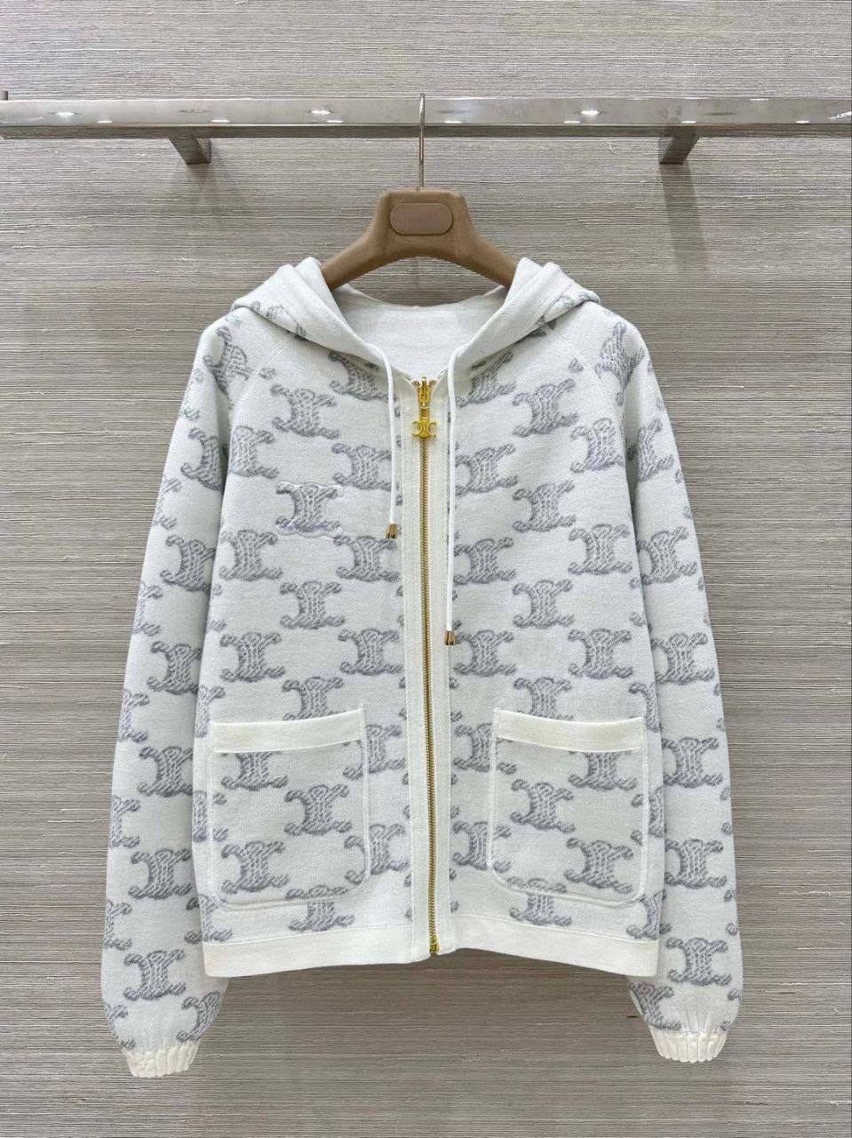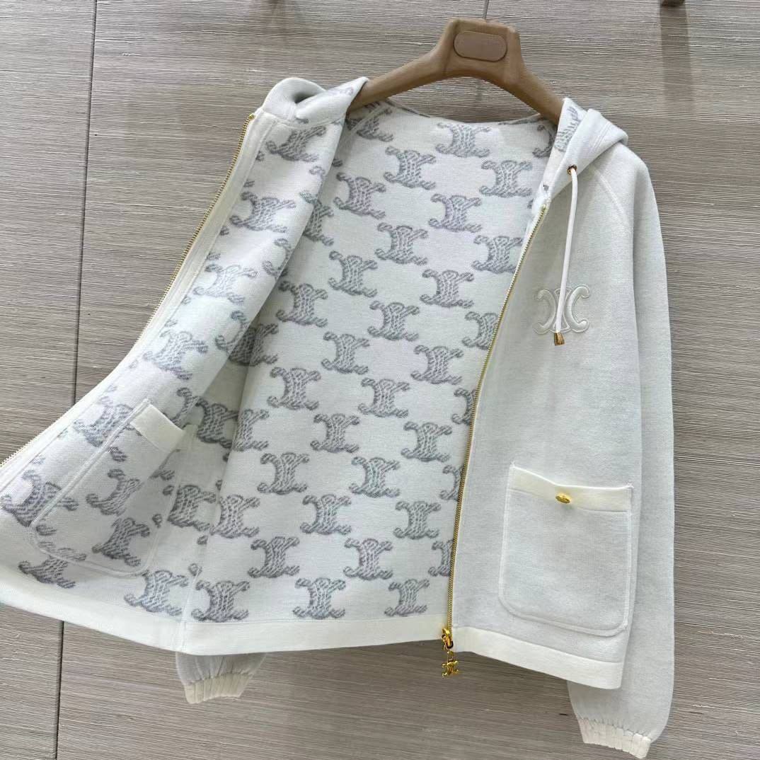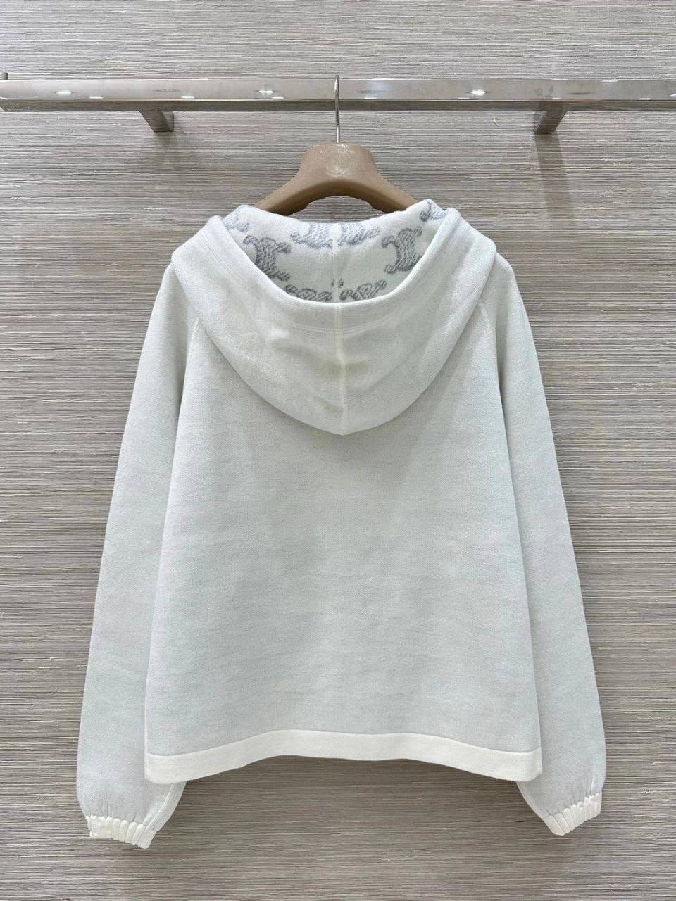 Двухсторонний кардиган Celine - это стильный и уютный элемент гардероба. Модель выполнена в светлых тонах с фирменным логотипом бренда. Кардиган застегивается на молнию и имеет удобный капюшон.