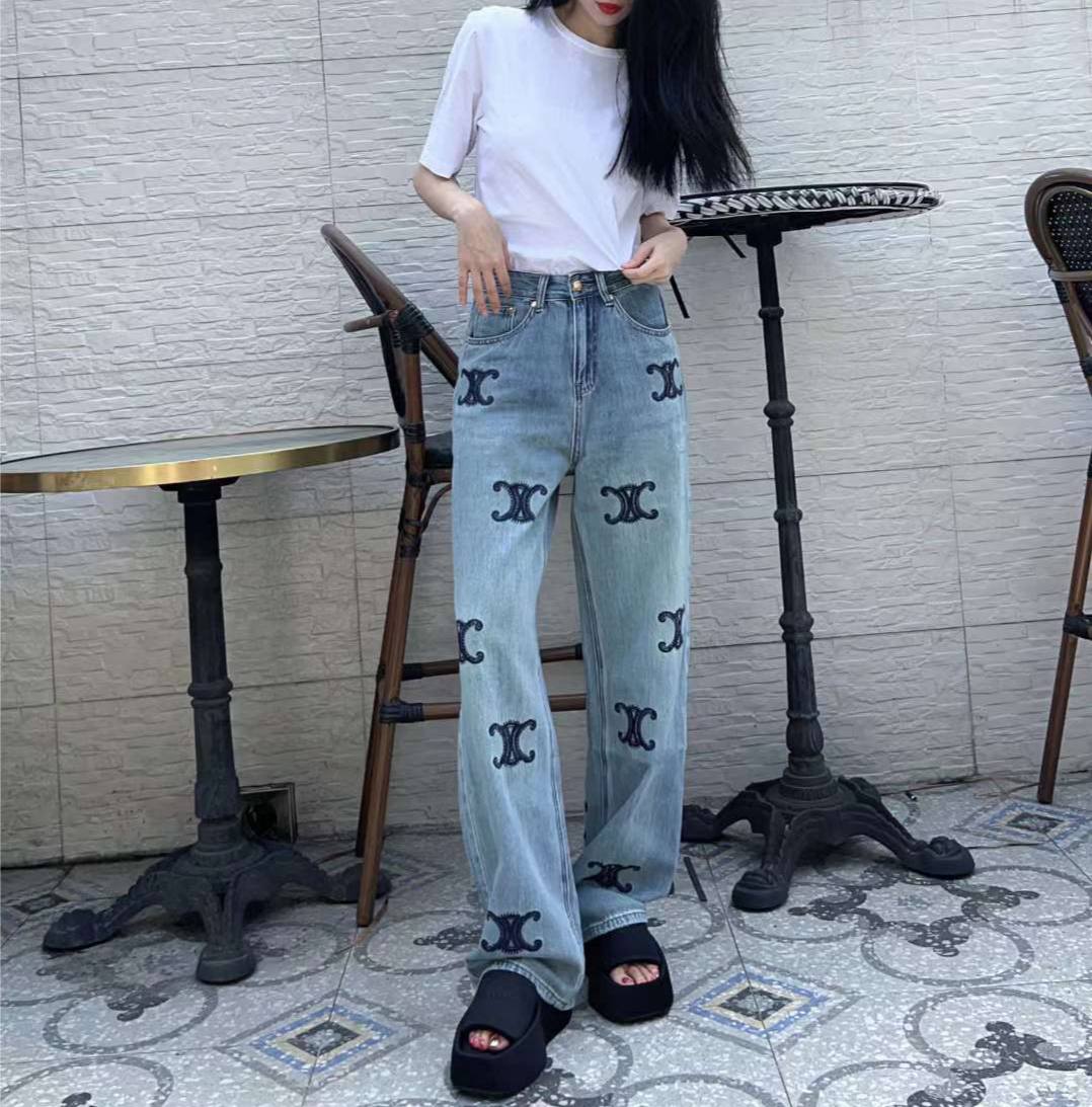 Джинсы Celine LUX-92165 — это стильные джинсы прямого кроя. Светло-голубой цвет с темными логотипами по всей длине. Отлично подойдут для создания повседневного образа.