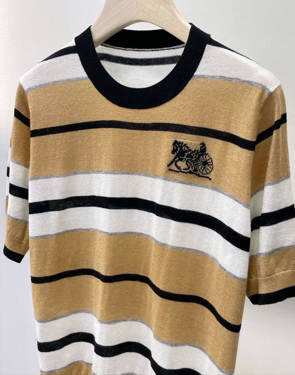 Футболка Celine LUX-68678 — это стильный и элегантный предмет одежды, который сочетает в себе классический дизайн и современный шарм. Её полосатый узор, выполненный в бежевых, белых и черных тонах, придает ей изысканный вид, а небольшая аппликация с изображением колесницы с лошадью добавляет утонченности. Эта футболка идеально подойдет для создания непринужденных, но в то же время утонченных образов на каждый день.