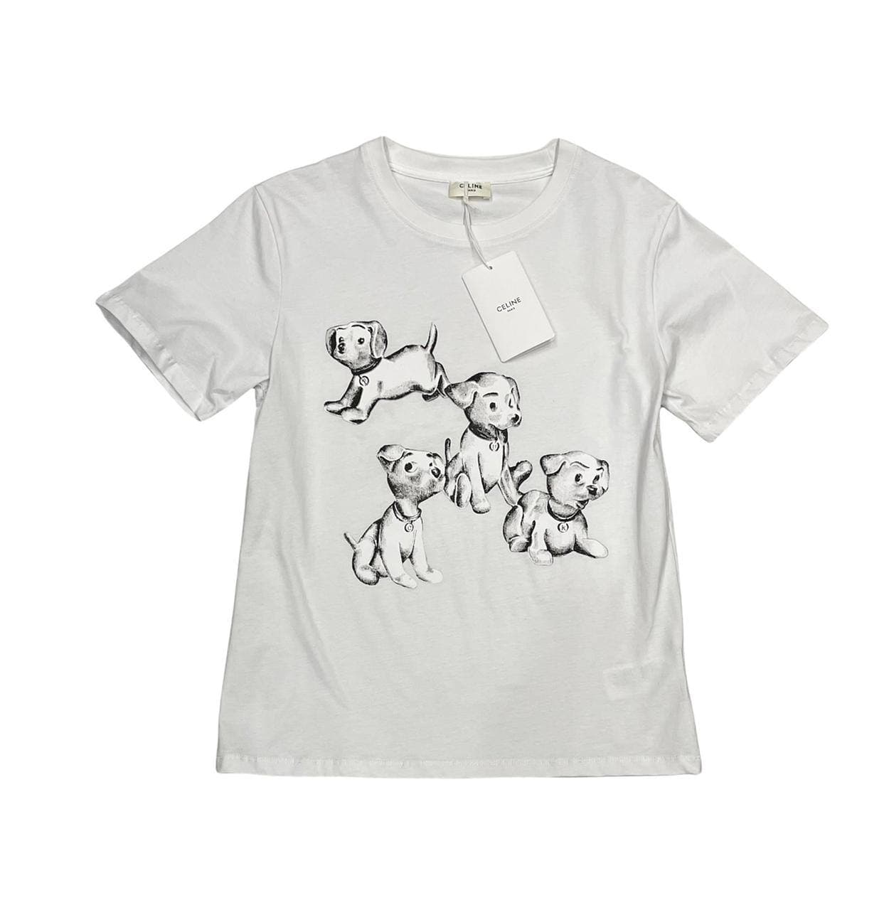 Футболка женская Celine LUX-62563 – это стильная и комфортная модель, выполненная в повседневном стиле. Белый цвет и милый принт с изображением щенков делают ее привлекательной и актуальной. Эта футболка идеально подходит для создания расслабленных образов на каждый день.