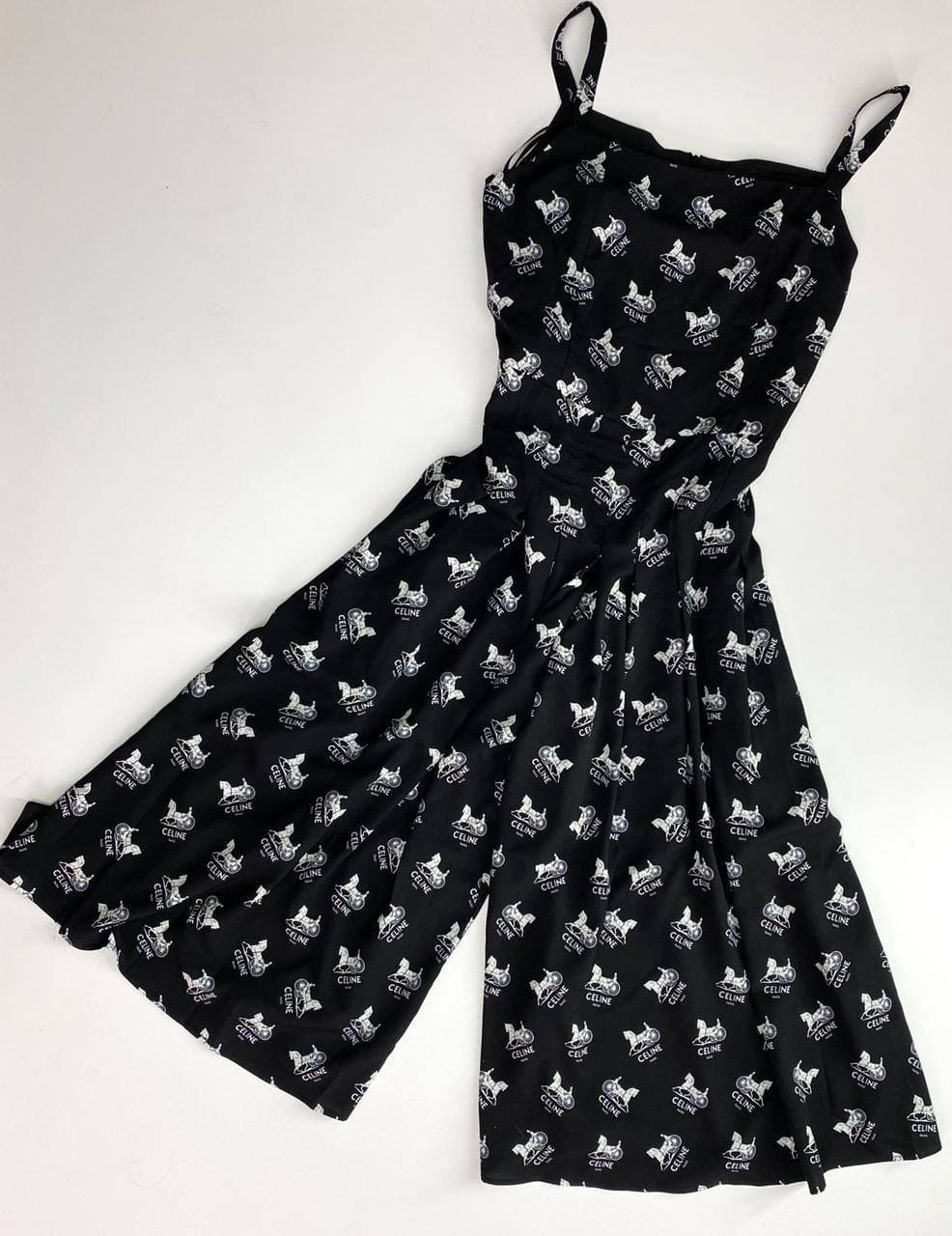Комбинезон Celine LUX-53817 представляет собой элегантное и стильное решение для женского гардероба. Черный фон дополнен повторяющимся узором из культового принта с изображением лошади и надписью "CELINE", что придает изделию узнаваемость и изысканность. Свободный крой брюк-палаццо и регулируемые бретели обеспечивают комфорт и свободу движений. Этот комбинезон идеально подойдет как для повседневных образов, так и для более формальных мероприятий, создавая модный и запоминающийся вид.
