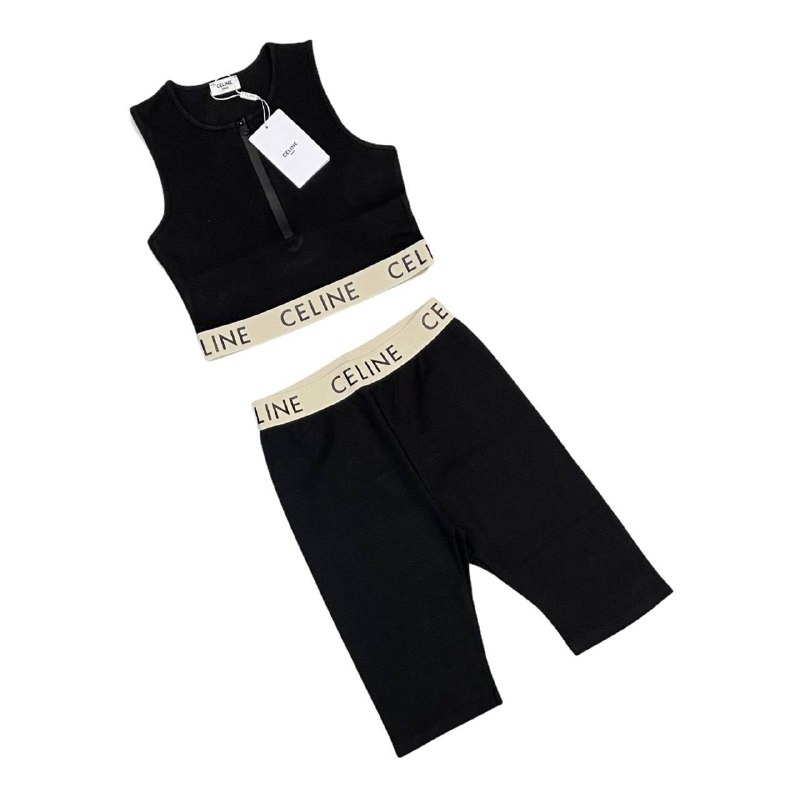 Представленный комплект, состоящий из черного кроп-топа на молнии и шорт-велотреков, выполнен в стиле athleisure. Эластичные брендированные пояса с логотипом Celine придают изделию узнаваемость и стильный вид. Комплект идеально подходит для занятий спортом, активного отдыха или повседневного ношения, сочетая в себе комфорт и модный дизайн.