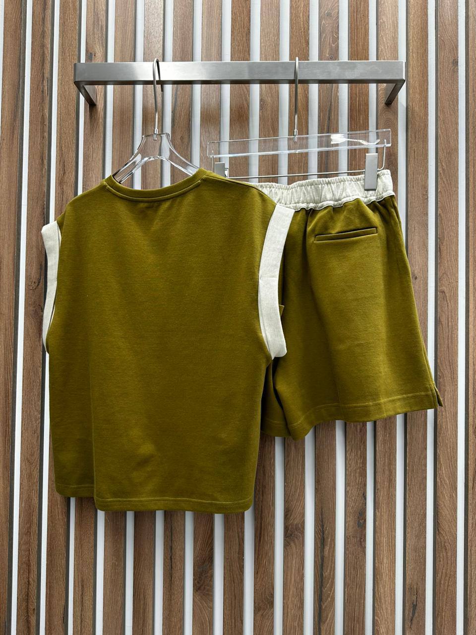 Костюм Celine LUX-90053 представляет собой стильный и удобный комплект в спортивном стиле. Он выполнен в оливковом цвете с контрастными деталями. Костюм состоит из футболки с укороченными рукавами и шорт с эластичным поясом. Этот комплект идеально подходит для повседневной носки, прогулок и активного отдыха.