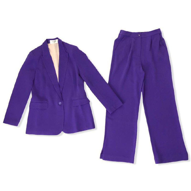 Костюм Celine LUX-48405 представляет собой элегантный комплект, состоящий из пиджака и брюк. Этот стильный костюм выполнен в насыщенном фиолетовом цвете, что придает ему особую привлекательность. Пиджак имеет классический крой с одной пуговицей и двумя накладными карманами, а брюки – прямой силуэт с высокой талией и разрезами по бокам.