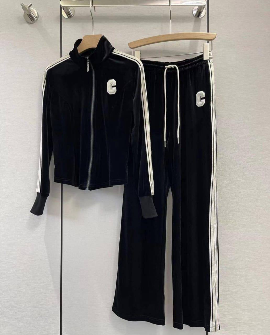 Костюм спортивный Celine LUX-76811 - это стильный комплект для повседневного гардероба. Состоит из куртки на молнии и брюк прямого кроя. Черный велюровый костюм дополнен белыми полосками и логотипом на груди и брюках.