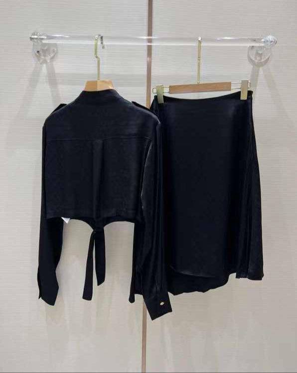 Костюм женский Celine LUX-85056 - это элегантный ансамбль, выполненный в классическом стиле. Комплект состоит из укороченной рубашки с длинными рукавами и юбки. Темный цвет придает образу изысканность. Текстура ткани создает ощущение роскоши.
