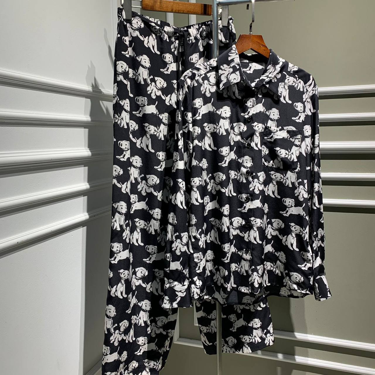 Костюм женский Celine LUX-68119 представляет собой стильный комплект, выполненный в оригинальном дизайне. Костюм включает рубашку свободного кроя с отложным воротником и брюки прямого силуэта с эластичным поясом. Оба изделия украшены забавным принтом с изображением далматинцев, что придает образу игривость и индивидуальность. Этот костюм станет отличным выбором как для повседневной носки, так и для создания расслабленных, но модных образов.