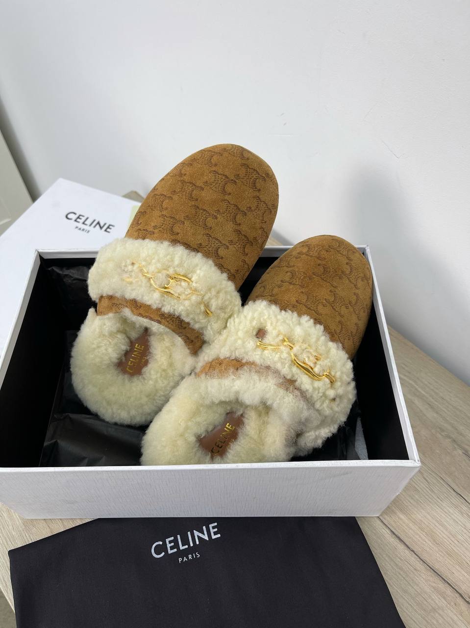 Мюли Celine LUX-54486 представляют собой стильный и комфортный выбор для домашней обуви. Эти изысканные мюли выполнены в коричневом цвете с узнаваемым принтом бренда. Теплая меховая отделка и золотистая пряжка придают им роскошный вид.