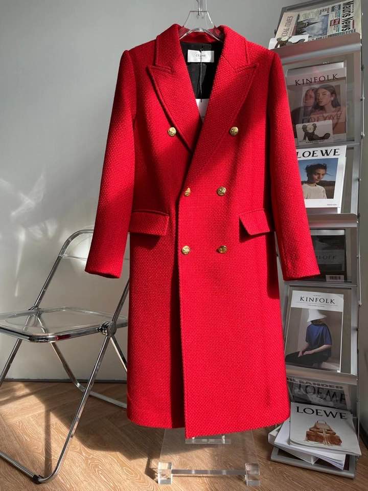 Это женское пальто Celine LUX-45558 представлено в ярком красном цвете, выполненное в классическом стиле с акцентом на элегантность. Двубортный крой и золотистые пуговицы придают изделию изысканный вид, делая его идеальным выбором для создания стильных и запоминающихся образов.