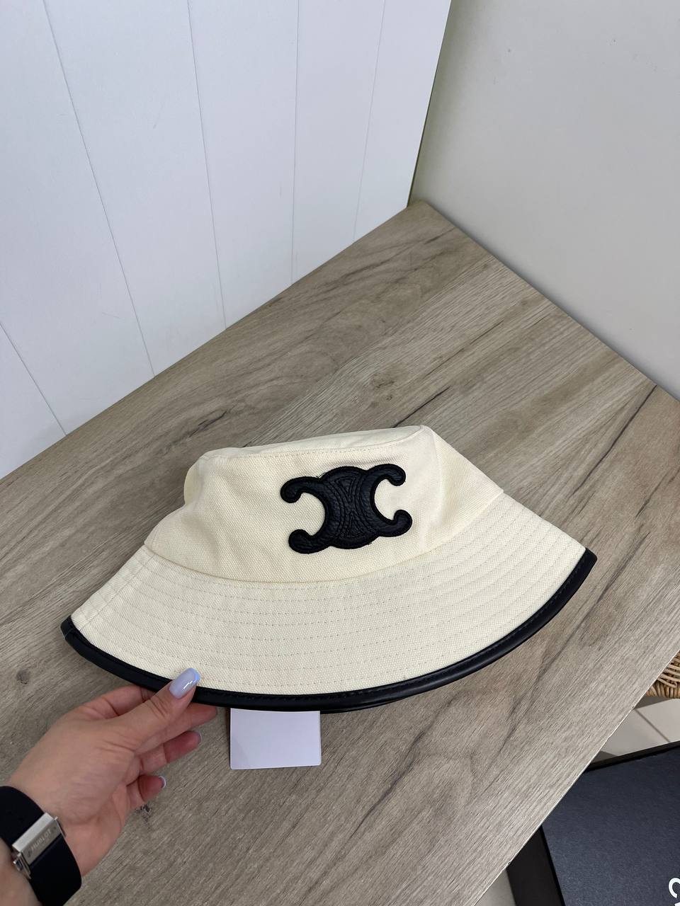 Панама Celine LUX-87844 выполнена в классическом стиле, сочетающем элегантность и практичность. Светлый основной цвет панамы дополнен контрастной окантовкой и черной декоративной деталью с логотипом бренда. Эта панама станет стильным дополнением к любому летнему образу, обеспечивая комфорт и защиту от солнца.