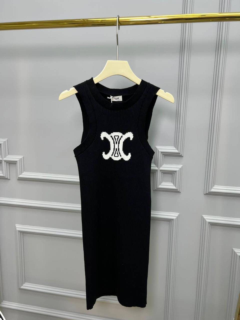 Платье Celine LUX-78501 представляет собой стильное и элегантное изделие. Это черное платье в рубчик с логотипом бренда на груди. Оно идеально подойдет для создания как повседневных, так и более формальных образов.