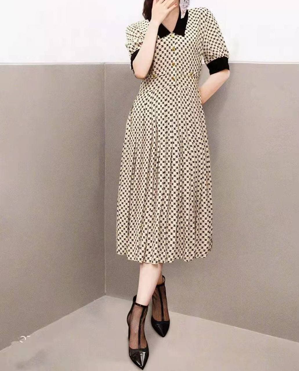 Это платье Celine LUX-61779 отличается элегантным дизайном и принтом, напоминающим логотип бренда. Модель с отложным воротником и короткими рукавами подчеркивает женственность, а расклешенная юбка с плиссировкой придает образу легкости и изящества. Идеальный выбор для создания стильных и запоминающихся образов.