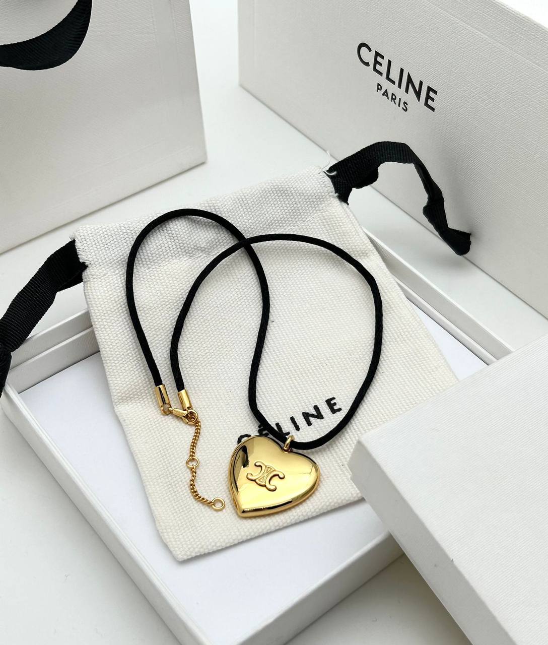 Подвеска Celine LUX-109873 — это элегантный аксессуар, который идеально дополнит ваш образ. Золотистая подвеска в форме сердца с логотипом бренда Celine на черном шнурке. Данный аксессуар может быть использован как самостоятельное украшение или в сочетании с другими аксессуарами.