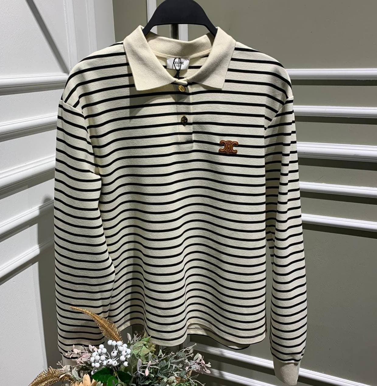 Это поло Celine LUX-54118 представляет собой стильную вещь в классическом морском стиле, идеально подходящую для создания непринужденных и элегантных образов. Поло выполнено в контрастную черно-белую полоску, дополненную отложным воротником и небольшим логотипом бренда на груди.