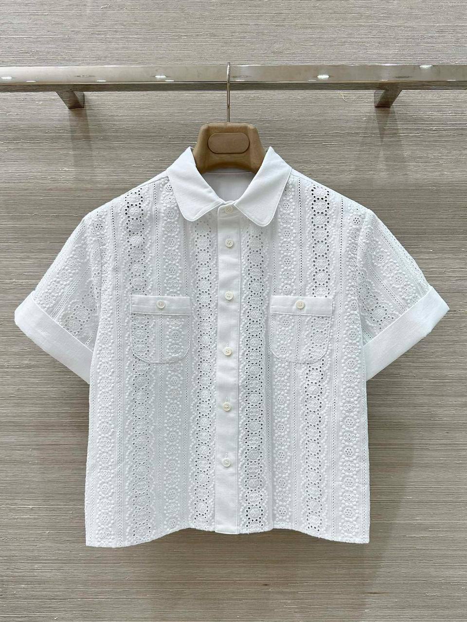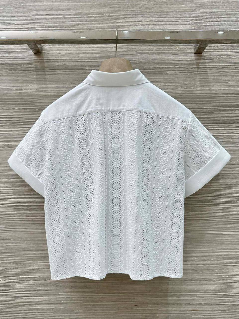 На изображении представлена женственная и элегантная рубашка Celine LUX-121124. Модель выполнена в белом цвете с ажурным узором, что придает ей легкость и изысканность. Идеальный выбор для создания летних образов.