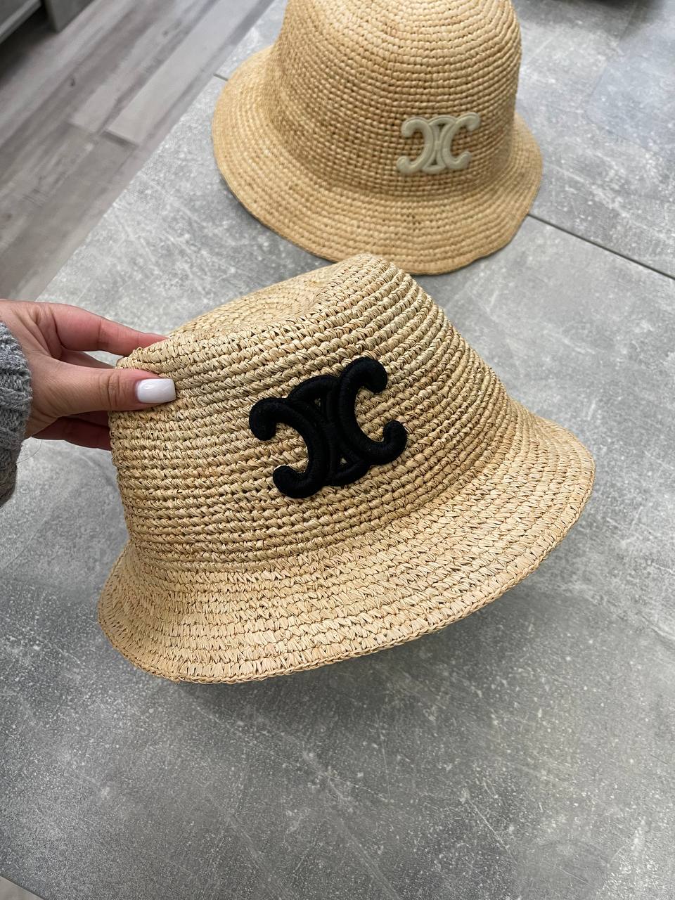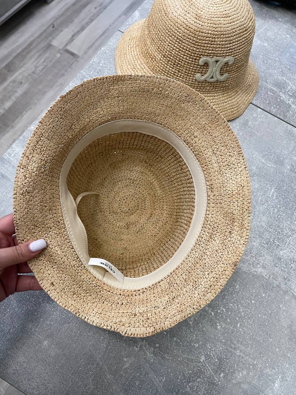 Шляпа Celine LUX-106418, представленная на изображении, выполнена в стиле панамы. Шляпа имеет бежевый цвет и плетеную текстуру. Она идеально подходит для защиты от солнца и создания стильного летнего образа.